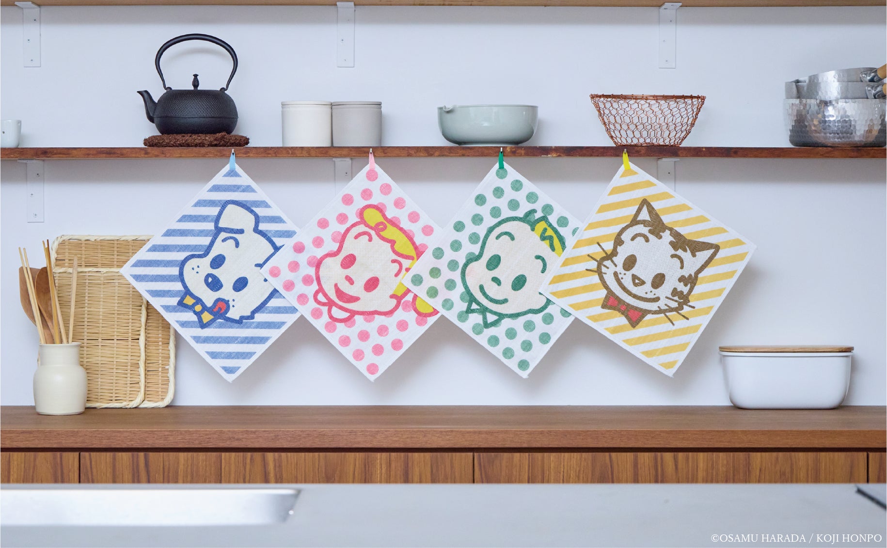 今回のコラボレーションでは、“暮らしの中に美しいものや、かわいいものを届けたい”という原田治氏の想いを、“日々の家事に彩りを添えたい”という想いから生まれた「かや織ふきん」にのせました。使うほどに手になじむ道具に愛らしいイラストレーションを添えた、使い勝手もよくキッチンに飾りたくなる一枚です。「OSAMU GOODS」の誕生50周年という大きな節目に、暮らしに寄り添う特別な「かや織ふきん」をお届けします。
