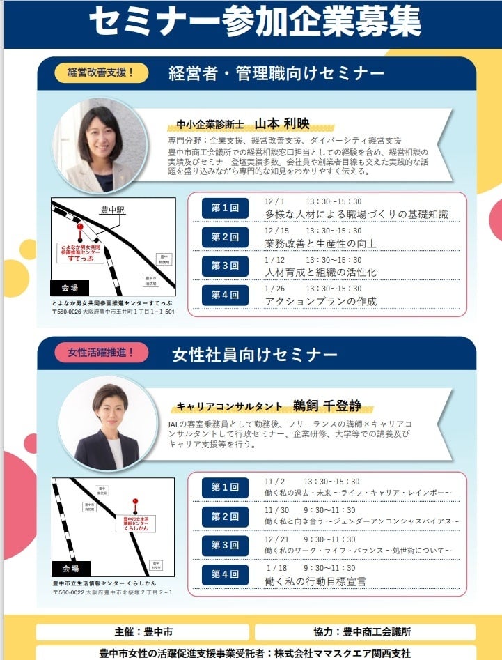 大阪府豊中市「女性活躍推進セミナー」参加事業者(無料)を募集!ママスクエアがサポートします。