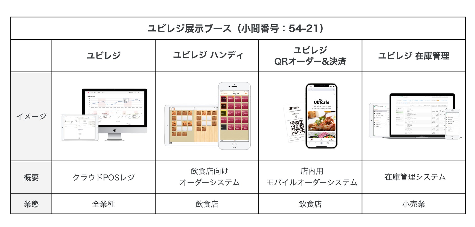 ユビレジの展示ブースでは、クラウドPOSレジ「ユビレジ」を中心に、飲食店向けオーダーシステム「ユビレジ ハンディ」、店内モバイルオーダーシステム「ユビレジ QRオーダー&決済」、在庫管理システム「ユビレジ 在庫管理」を実機でご体験いただけます。また、昨年7月に提供を開始した大規模導入向けサービス「ユビレジ エンタープライズ」のご紹介やご相談も展示ブース内で承ります。「人手不足への対応」「業務プロセスの標準化」「売上・顧客データの統合活用」といった課題に対して、ユビレジが提供する店舗DXの可能性をぜひ会場でご確認ください。