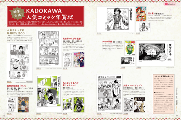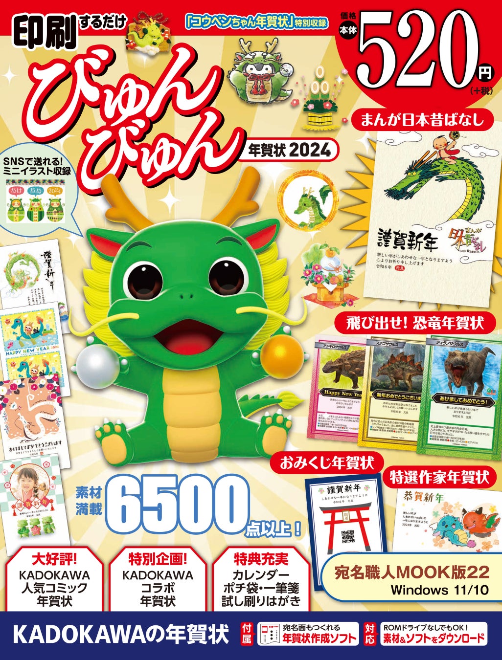 2024年版では特典として、かわいいコウペンちゃん年賀状や、人気コミックの1シーンを使ったオリジナル年賀状など、KADOKAWAならではのデザインを豊富に収録しています。