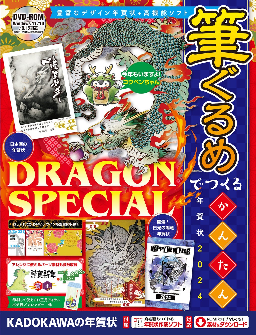 老舗の年賀状作成ソフト「筆王 特別版」が付属。誰もが知る天井画をモチーフにした「日光の鳴竜」デザインや、横山大観「龍興而致雲」をはじめ落ち着きのある日本画デザイン、モダンでスタイリッシュな筆文字デザインなどを収録しました。