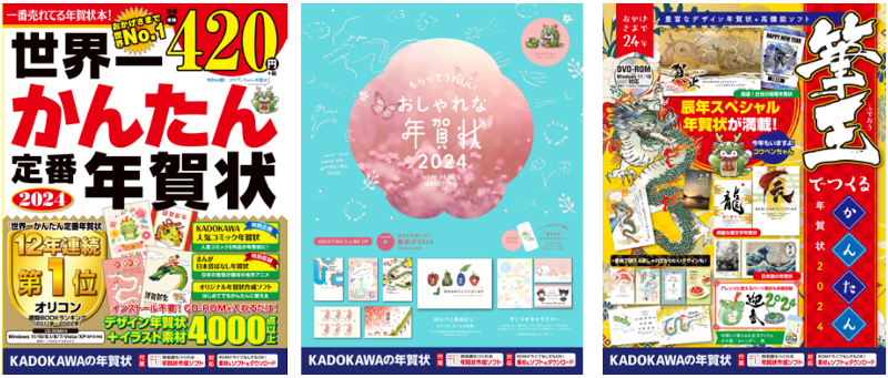 年賀状作成の幅広いニーズに応える「KADOKAWA 年賀状素材集2024年版」は、全国の書店およびインターネット書店にて発売します。