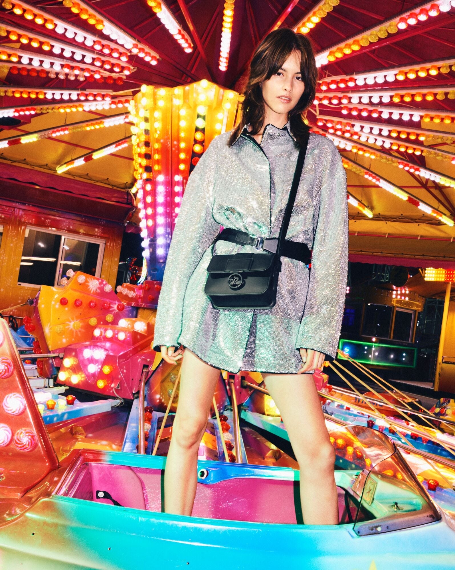 スパンコール、メタリック、エナジー溢れる色彩 – 「ロンシャン大学」に入学した国際色豊かな大学生たちがパリのアパルトマンでルームシェアをしながら“現代のパリジェンヌ”へと成長する一年を表現した2024年春夏コレクション「LONGCHAMP UNIVERSITY」の序章は、「PARIS IS A PARTY」と題し、ホリデーシーズンを彩るパーティーの美学を表現いたします。パリのナイトライフを初体験する大学生たちは、冬の風物詩である移動遊園地を包むネオンの煌めきに勝るものはないと知り、一緒に楽しい時間を過ごします。クリエイティブ・ディレクター ソフィ・ドゥラフォンテーヌは、ホリデーシーズンのコレクションに自身のポジティブなスピリットを投影し、パリの夜を照らし出すようにその眩さや煌めきをデザインに散りばめています。