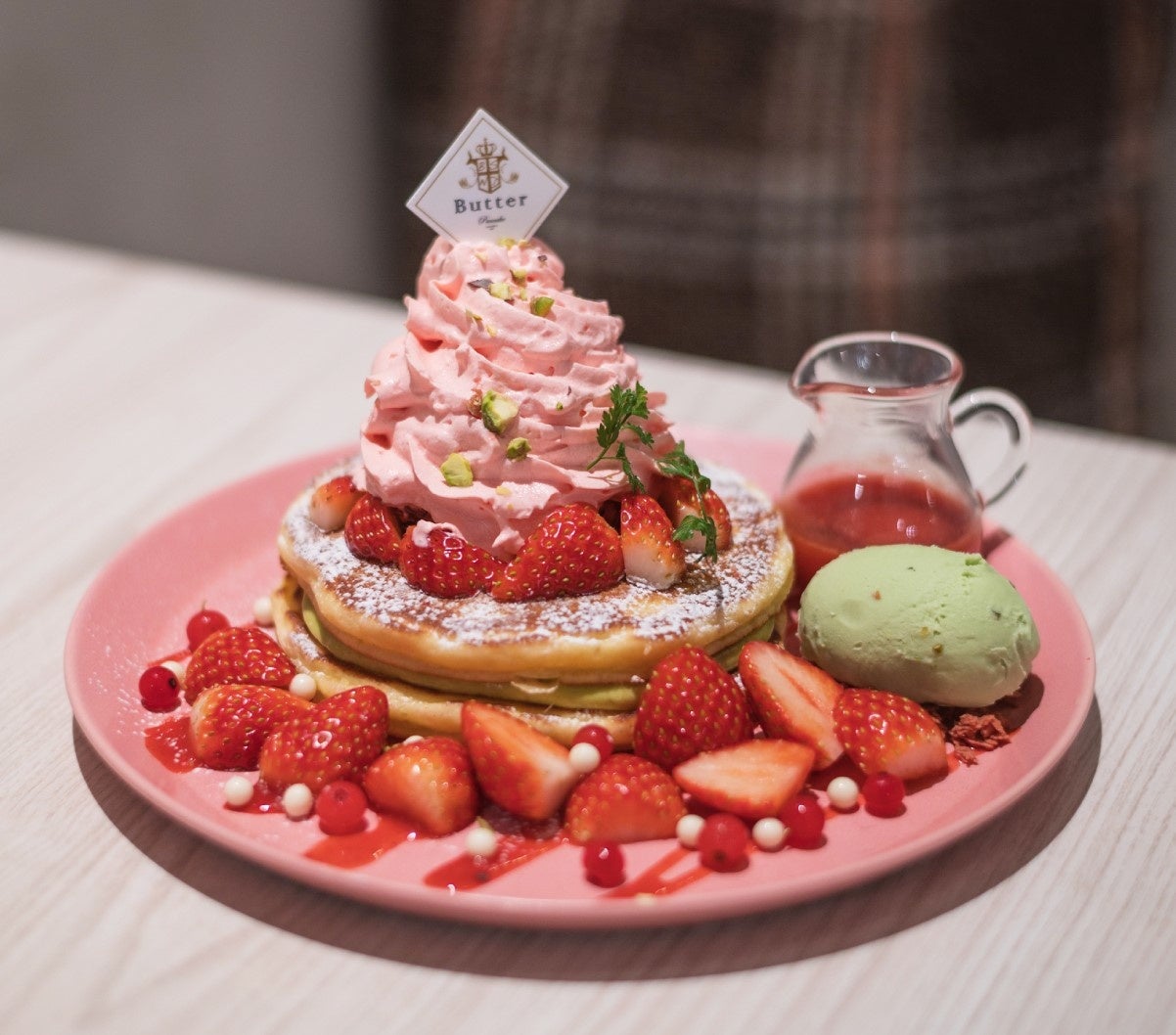 1,580円/パンケーキの間に潜むピスタチオクリームがアクセント。ソース・ホイップ・アイスまで、”いちご×ピスタチオ”が織りなす最旬スイーツ。