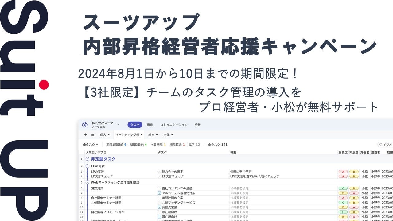 2024年8月1日から10日までの期間に、スーツアップの無料お試し30日にお申込みいただきました、内部昇格経営者が代表者に就いている会社のうち3社限定で、当社代表者であり中小・中堅企業やスタートアップのバリューアップに実績のあるプロ経営者の小松自ら、チームのタスク管理の導入サポートを無料で行うキャンペーンを実施します。