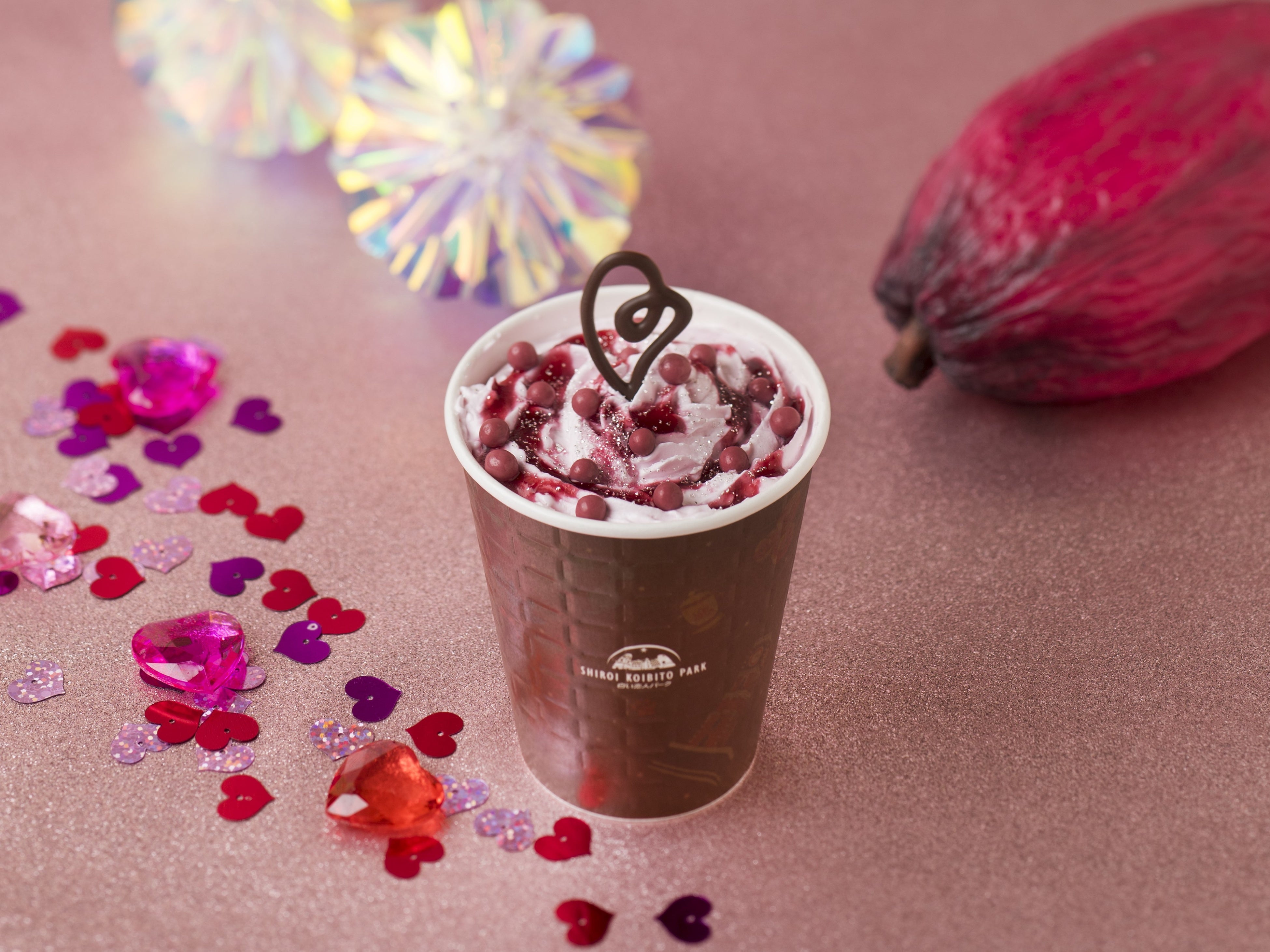 白い恋人チョコレートドリンクを使用し、ストロベリーホイップとルビーチョコレートで酸味をプラス。片想いの甘酸っぱさをイメージしました。