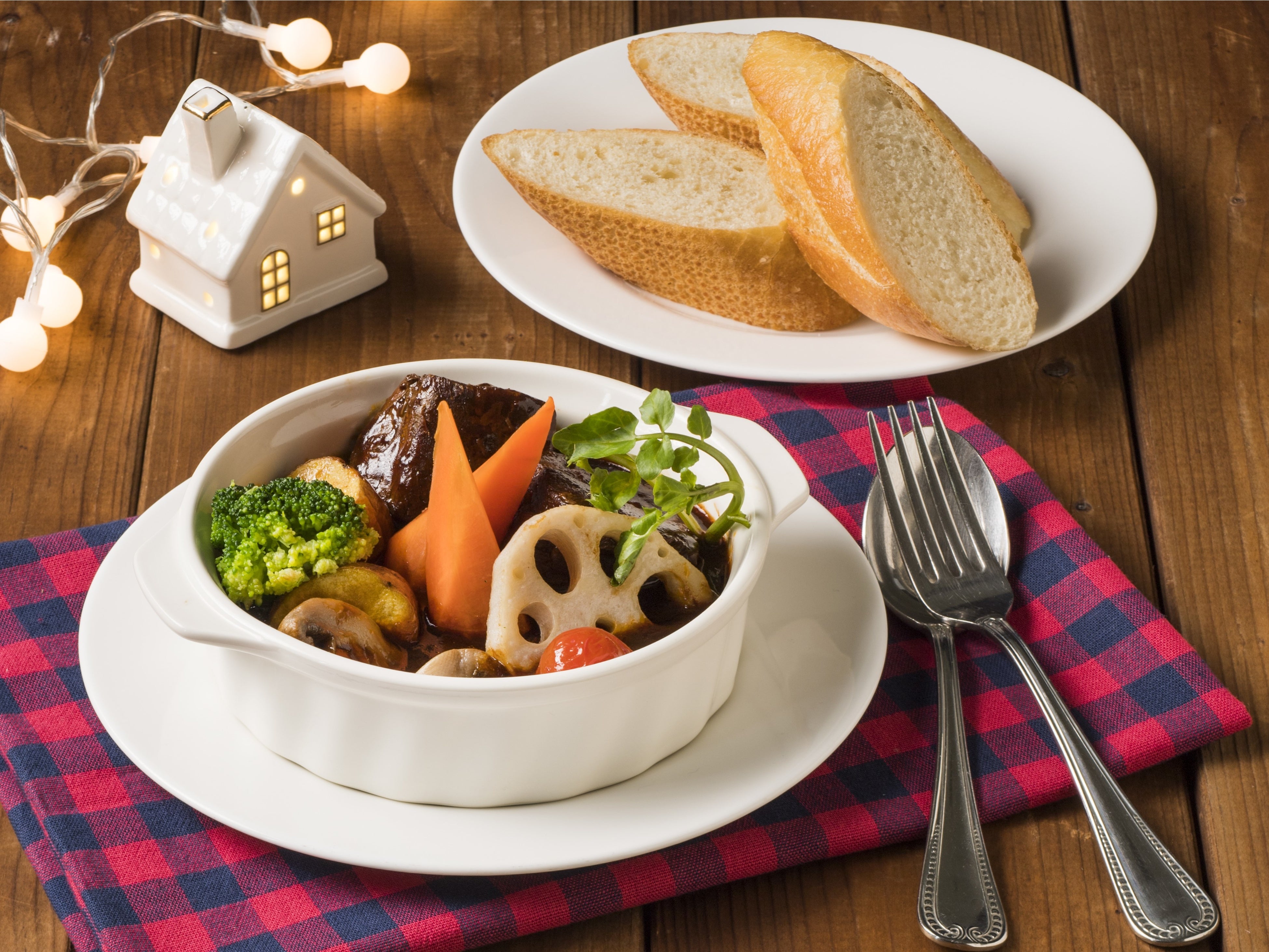 肉の旨味が溶け込んだ、具沢山なビーフシチュー。隠し味のチョコレートが味に深みを加えています。