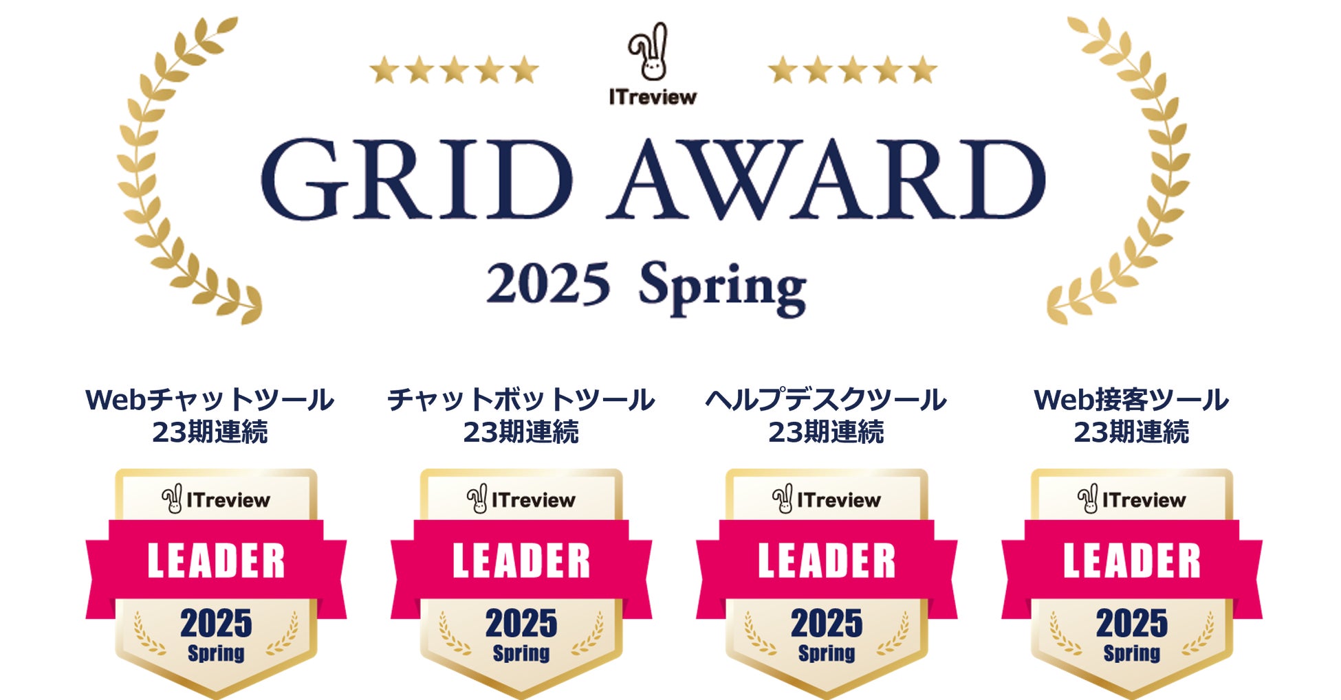 IT製品のレビュープラットフォーム「ITreview」において、「ChatPlus(チャットプラス)」は ITreview Grid Award 2025 Spring にて、4部門で23期連続のLeaderに選出されました。