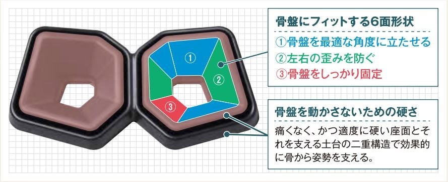 置いただけでスッとまっすぐ立つたまごパックの形状をヒントに、骨盤がしっかりフィットして自然と立つ、斬新な形状となりました。また、骨盤にピッタリフィットさせるために6面形状を採用。人間工学に基づいた特殊形状で長時間使用しても疲れ、痛みを感じにくい仕様になっています。
