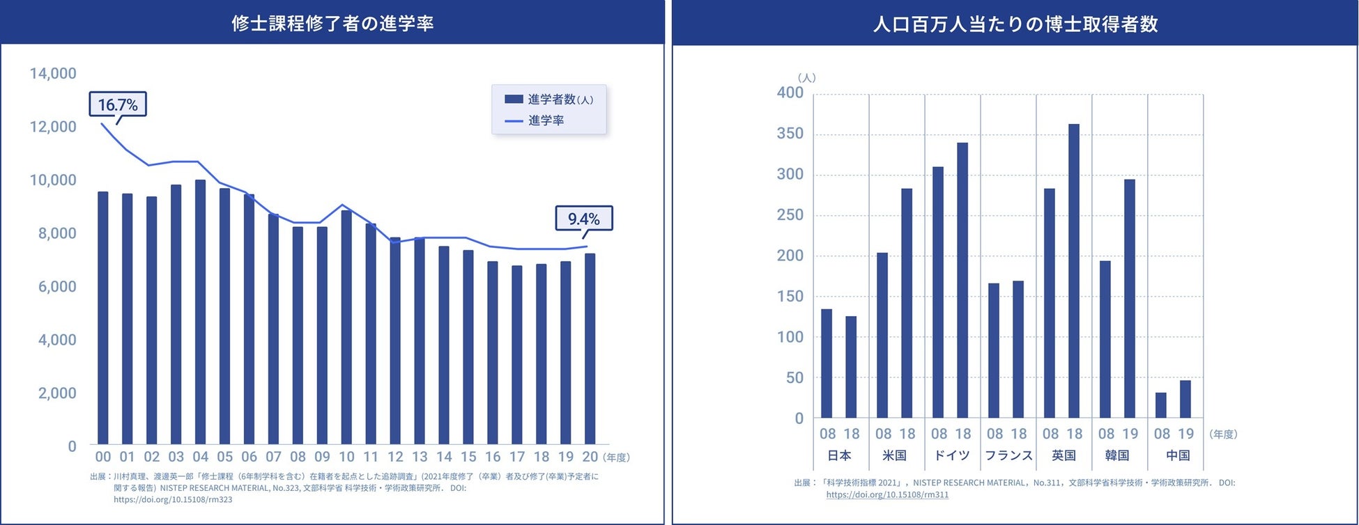 修士課程修了者の博士課程への進学率は、2012年以降10%弱と低迷しており、人口100万人当たりの博士号取得者数も120名と他国に比べて低い水準にあります。こうした現状を踏まえ、文部科学省は2024 年3月26日に「博士人材活躍プラン〜博士をとろう〜」を発表し、「博士人材が、アカデミアのみならず 、多様なフィールドで活躍する社会の実現」をビジョンとして掲げています。