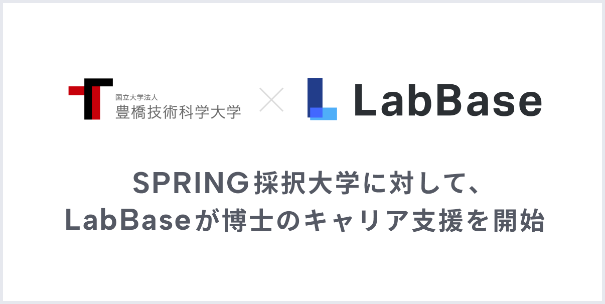 LabBaseは「研究の力を、人類の力に。」をパーパスに掲げ、創業以来一貫して理系修士学生を中心とした理系学生のキャリアを支援してきました。今後はSPRING採択校をはじめ各大学と連携しながら、博士のキャリア支援を拡大し、キャリアの不安なく博士に進学しやすい社会を創って参ります。