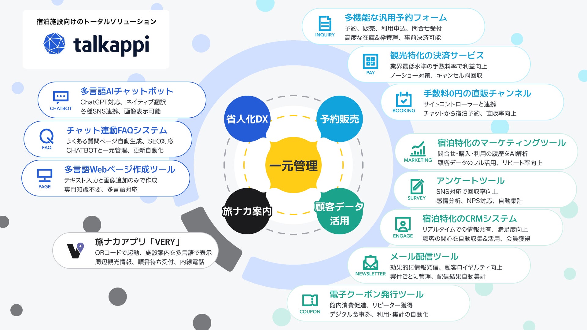 「talkappi」は、観光分野に特化したAI活用の顧客体験プラットフォームで、観光・宿泊施設にトータルソリューションを提供いたします。日本語、英語・中国語(簡体字・繁体字)・韓国語を含む最大134言語に対応し、日本の代表的なホテルや旅館・観光自治体・観光体験事業者が多く利用しています。