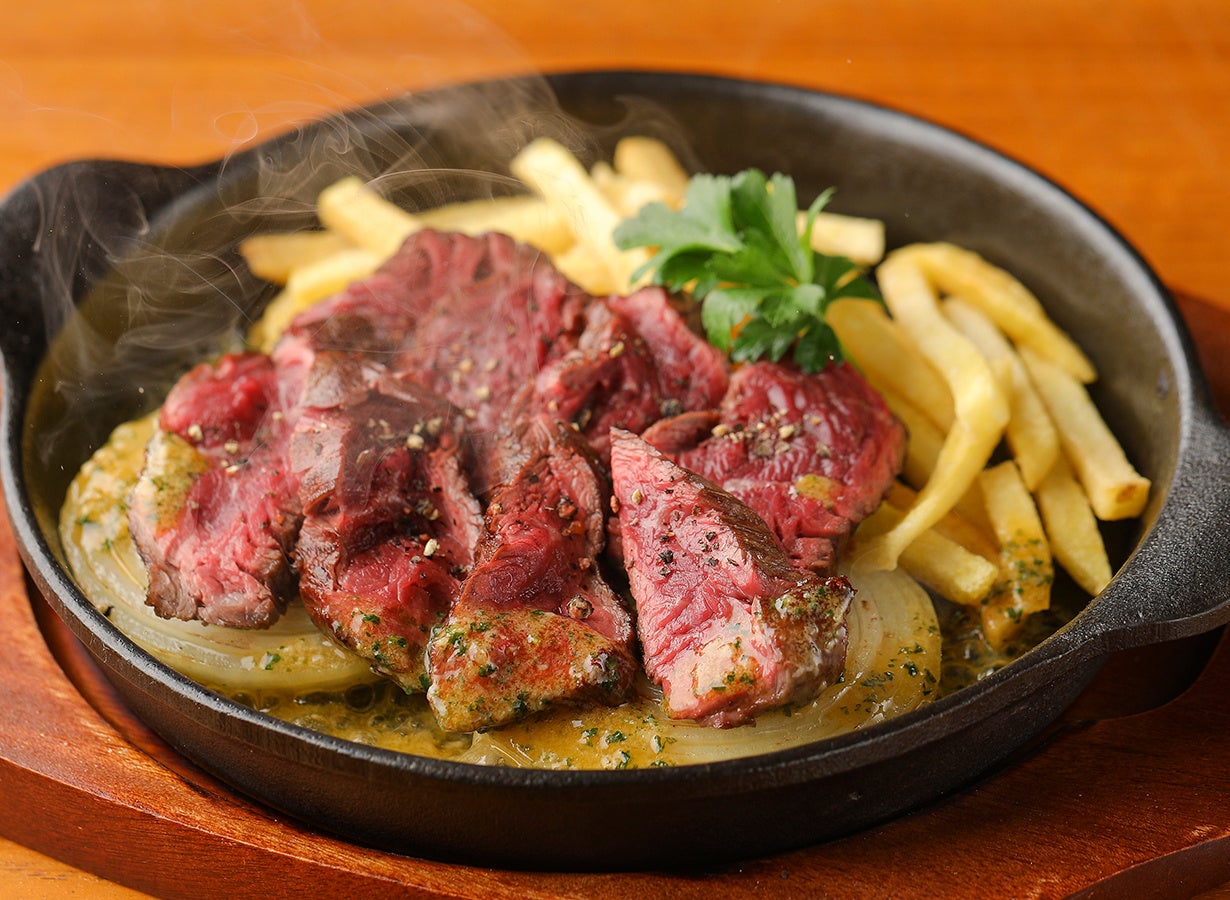 ビストロの定番、牛ハラミステーキをワイン倶楽部流の食べ方で!お肉をソースに絡ませて鉄板でロティ。
