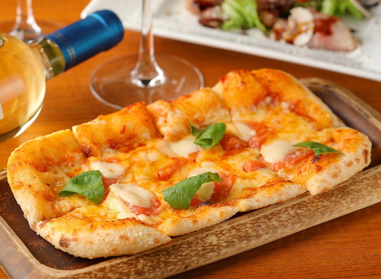 もちもちのナポリ風ピッツァは程よいサイズで全3種。ワインに合わせてお楽しみください。