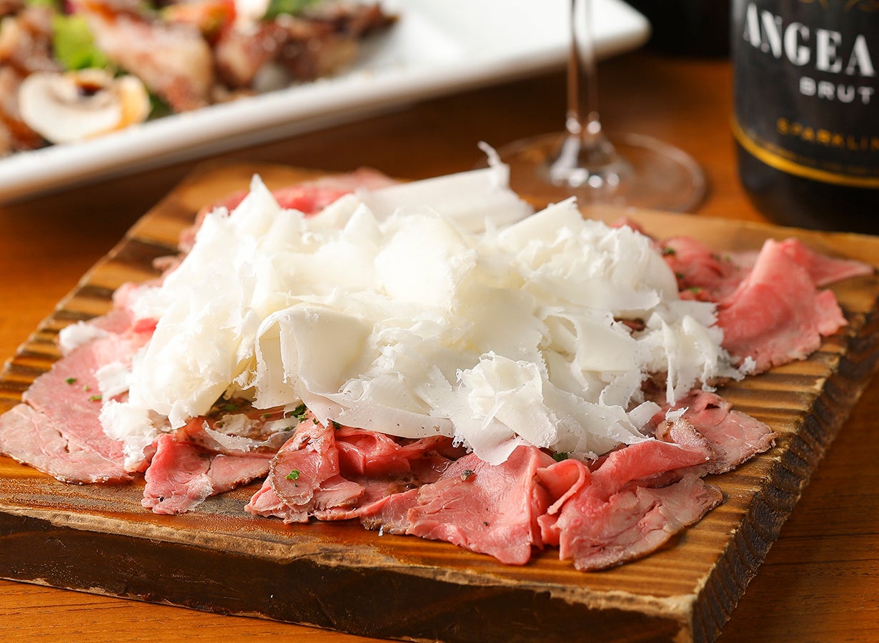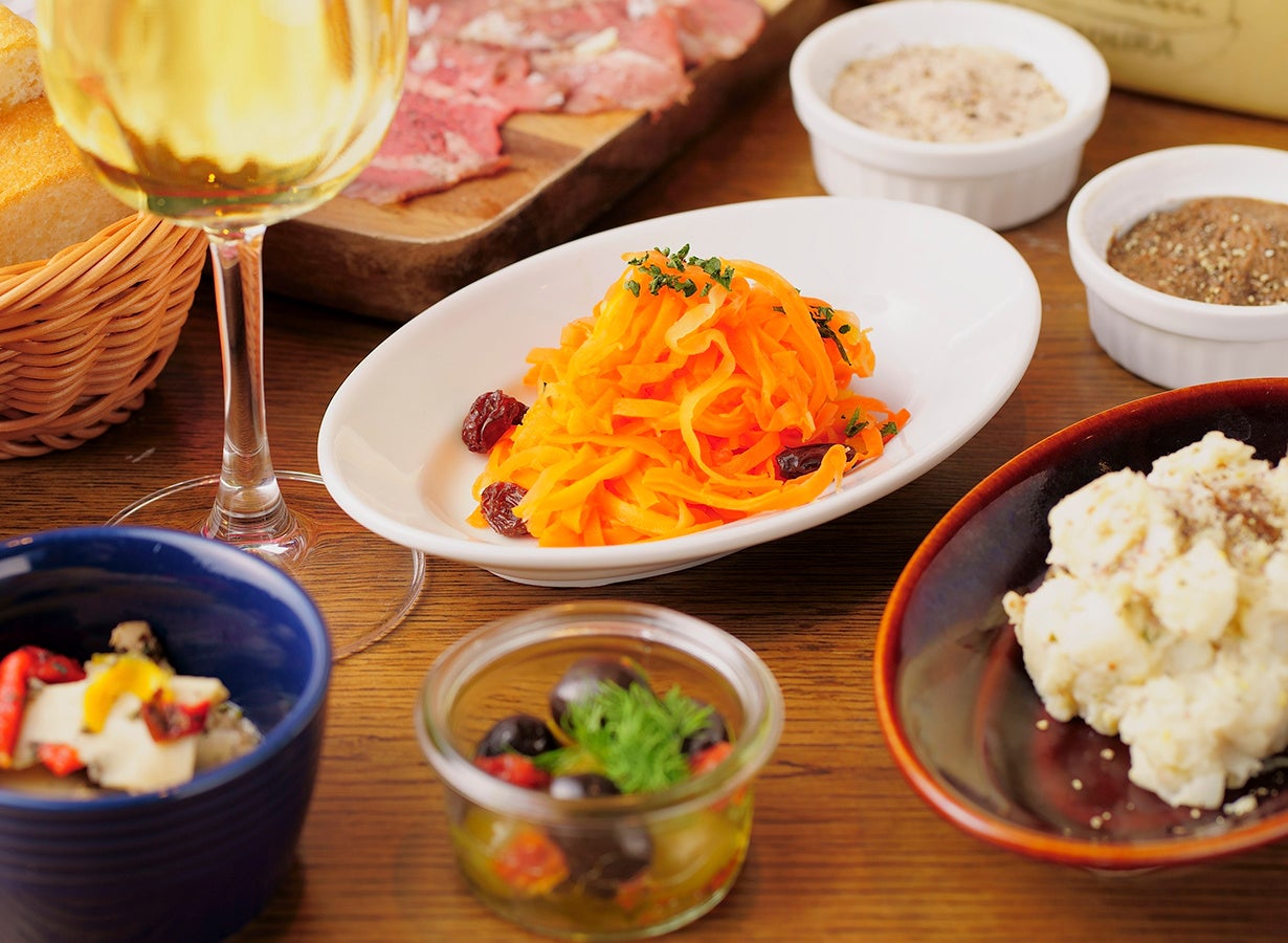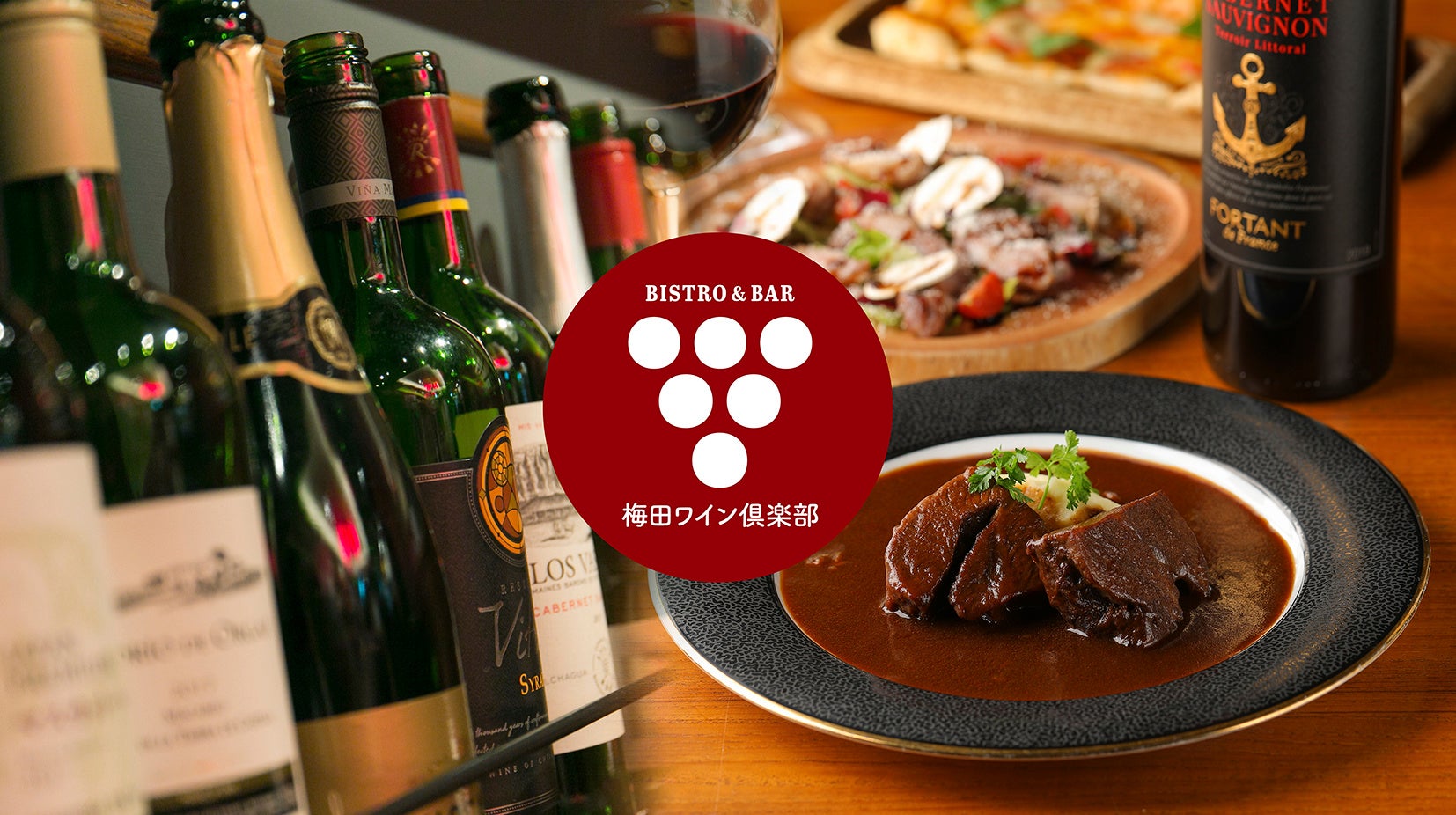 ワインにピッタリな小皿料理でカジュアルにワインを楽しむ『梅田ワイン倶楽部』は至福のワイン時間を演出します。「ロティールバベットステーキ」や「牛ほほ肉の赤ワイン煮込み」「鹿肉のソーセージ」や「もちもちのナポリ風ピッツァ」をはじめ、ワインとのペアリングが考えられた料理の数々がラインナップ。