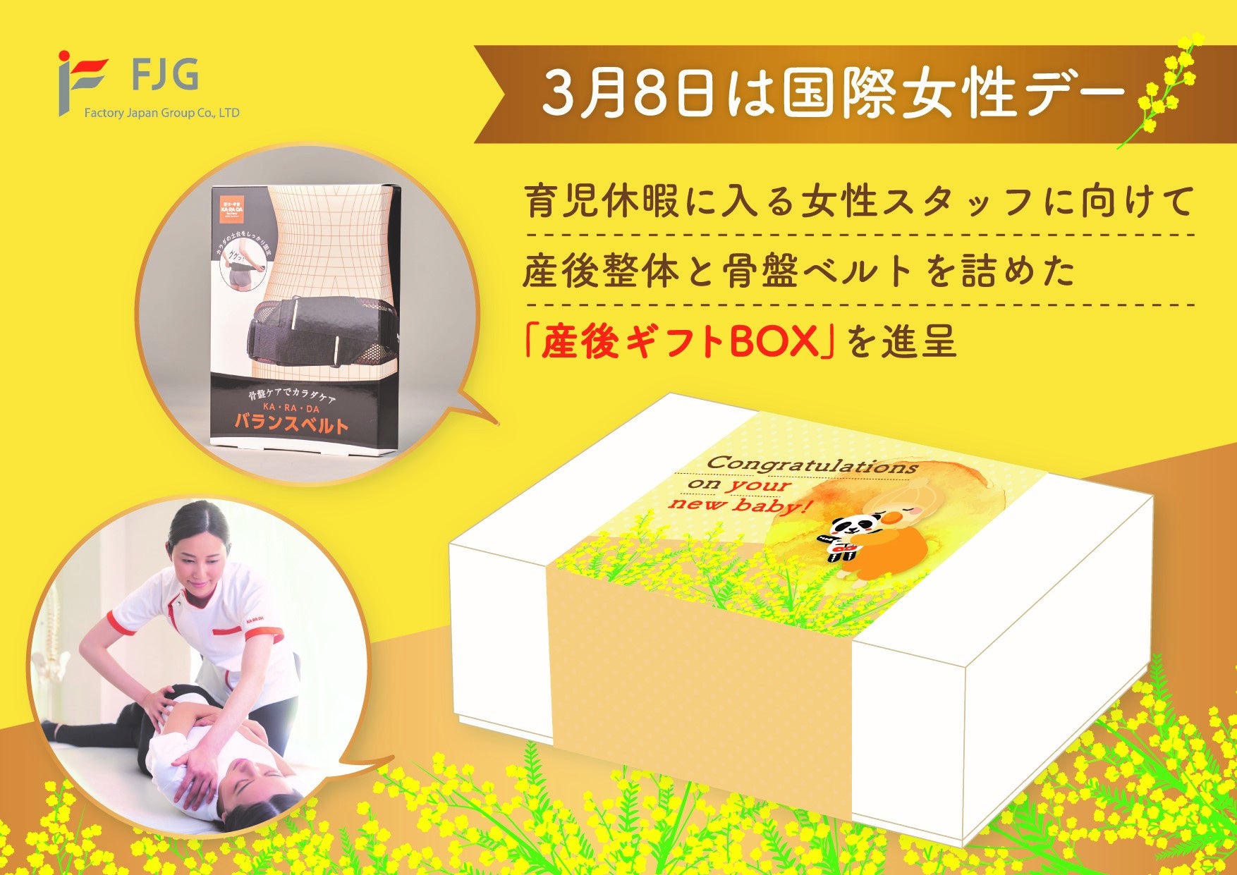 ファクトリージャパンは、この特別な日を記念し、今後、育児休暇に入る女性スタッフに向けて「産後ギフトBOX」を贈呈することを決定しました。この産後ギフトBOXは、「産後向け整体・骨盤調整コース」の施術チケットと「KA・RA・DAバランスベルト(骨盤ベルト)」のセットが詰められているものとなっております。
