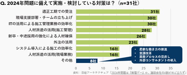 日経アーキテクチュアの調査によると、2024年問題への対策としては現場業務の改善に重点が置かれ、人事労務などのバックオフィス業務の改善を実施した会社は少数にとどまっていることが明らかになっています。