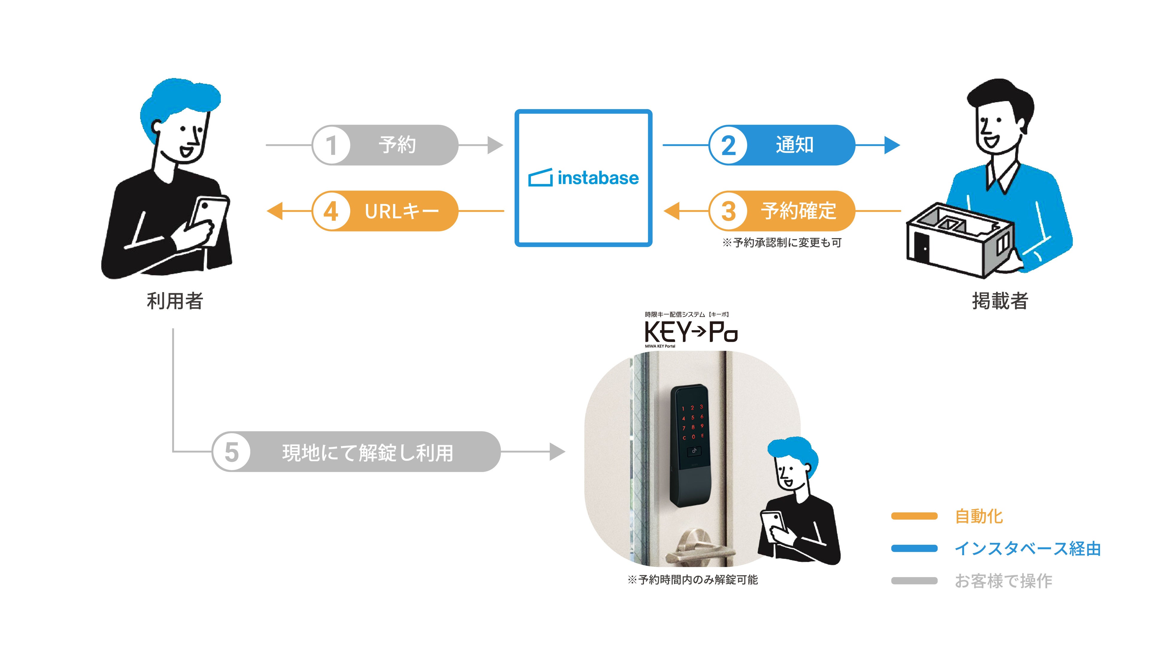 インスタベース経由で予約が入ると、利用者にURLキーが自動送信されるため、物理鍵の受け渡しが不要になります。