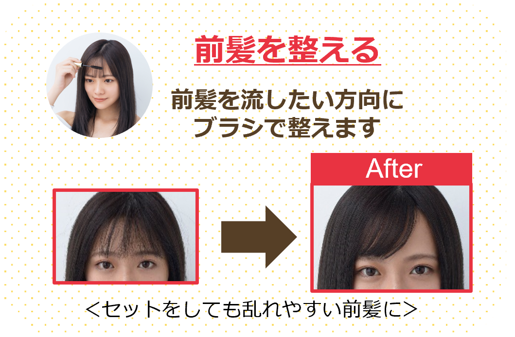 前髪・アホ毛※1・おくれ毛を抑えたい方向にブラシでとかしてなじませることで、簡単にスタイリングができます。