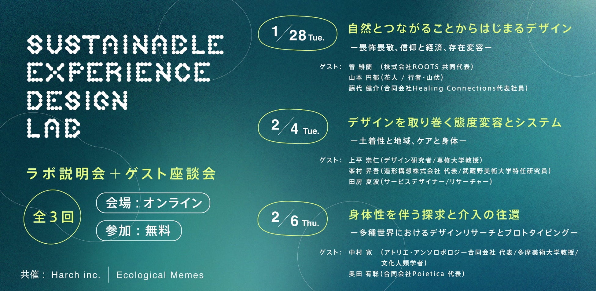 ハーチ株式会社(東京都中央区、代表取締役:加藤佑)と、一般社団法人Ecological Memes(東京都渋谷区、代表理事:小林泰紘)は、持続可能かつ再生型の社会の実現のために、市民一人ひとりの暮らしや行動の変容を生み出す、エクスペリエンスデザインの可能性を探るラボ「Sustainable Experience Design Lab」を立ち上げ、探索プログラムメンバーの募集を開始します。