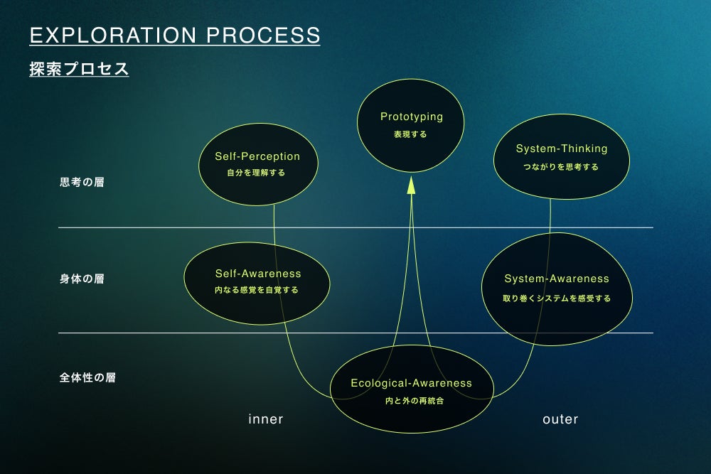 個と全体、内と外の行き来を重視した探索を行います。思考や分析など頭の世界だけで完結させず、身体実感を伴う気づきや、その先にある全体性とのつながりの感覚からアウトプットを創出することを目指します。