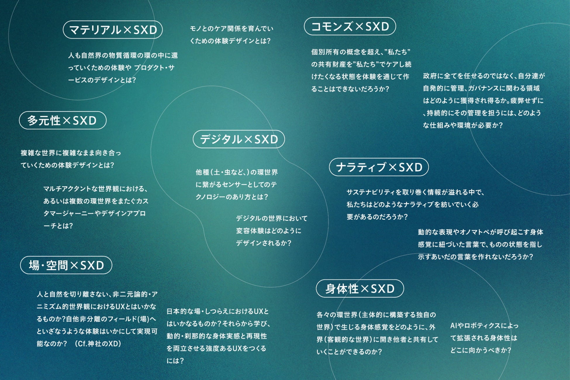 Sustainable Experience Design Lab(以下、SXD Lab)は、持続可能かつ再生型の社会の実現のために、市民一人ひとりの暮らしや行動の変容を生み出す、体験デザインの可能性を探るラボです。