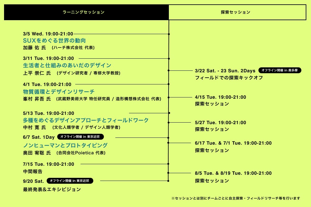その後、共鳴する問いや世界観を持つ仲間とチームを組み、インタビューリサーチやフィールドワーク、プロトタイピング等を進めながら探索を深め、プログラムの最後には探索プロセスや成果を公表するエキシビションを開催予定です。