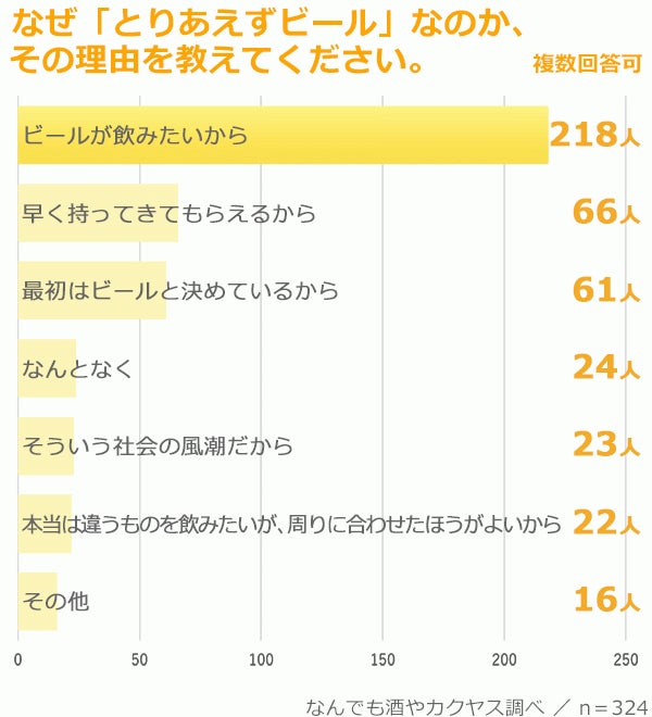 ちなみに、“とりビー派”ではない人になぜビール以外のものを注文するのか、その理由を聞いてみたところ、「好きなものを飲みたいから」が最も多く、次が「ビールが飲めないから、苦手だから」でした。