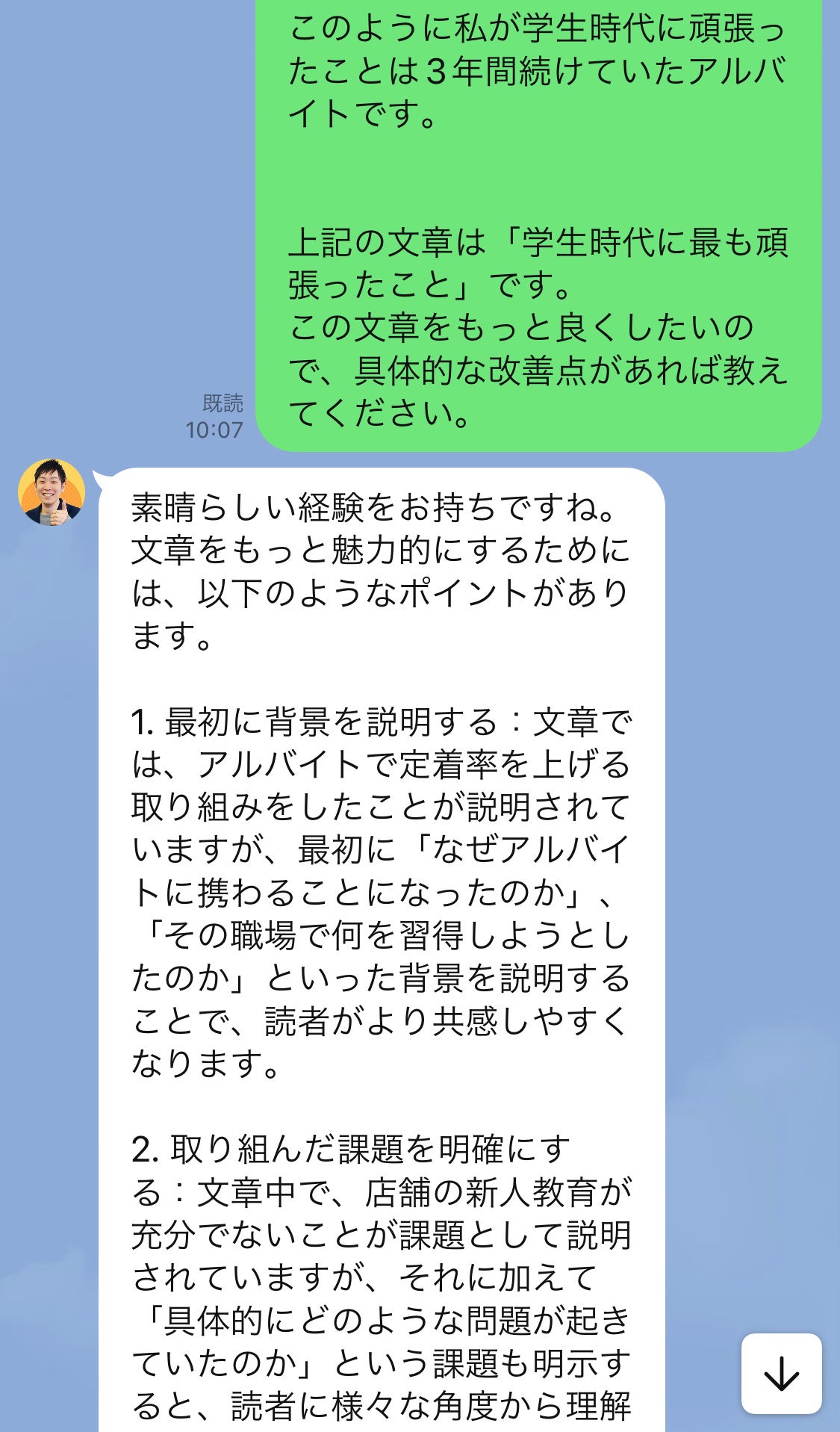 「添削してほしい文章」と「改善点を教えてほしい」旨を送れば、内容のアドバイスができる。