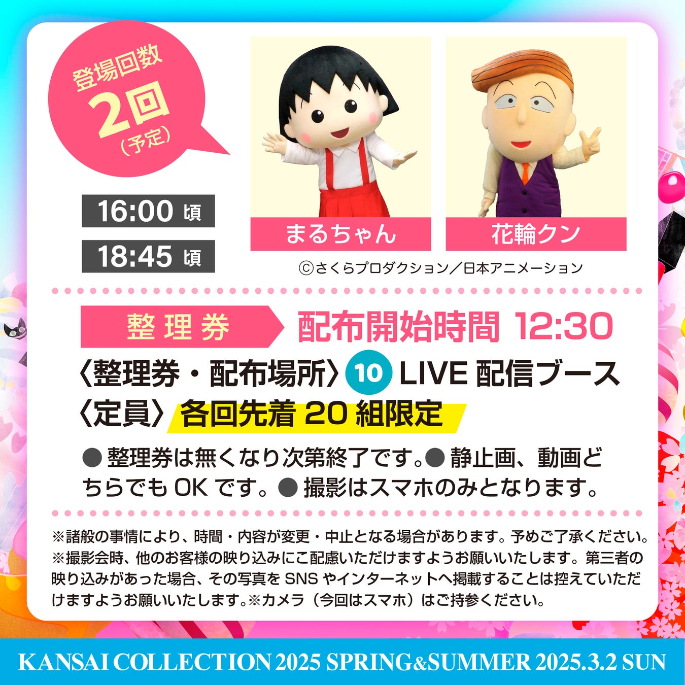 16:00頃と18:45頃に、LIVE配信ブースにまるちゃんと花輪クンが登場し、来場者と一緒に撮影会を開催します!