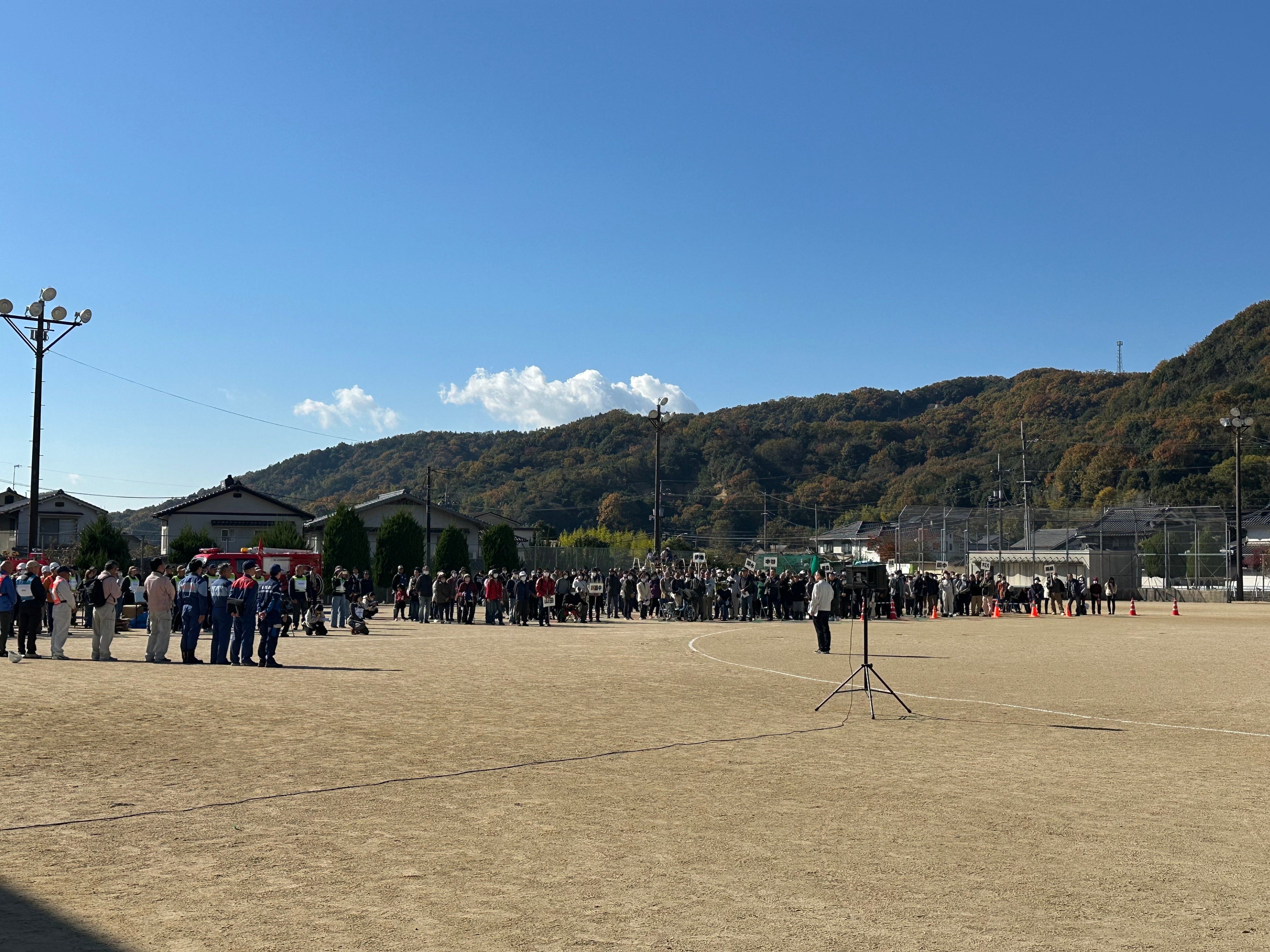 1. 人文字「SOS」の上空確認訓練 開始時、三谷分校グラウンドに避難した住民約70名が人文字で「SOS」を形成。広島県防災ヘリコプターおよびドローンが上空から確認し、孤立状況の把握から救援要請までの一連の流れを訓練しました。ヘリテレ映像は中条小学校本部にリアルタイム配信され、自主防災組織が孤立情報を関係機関へ伝達する手順を確認しました。 |