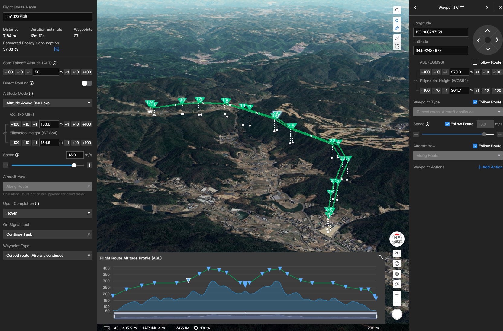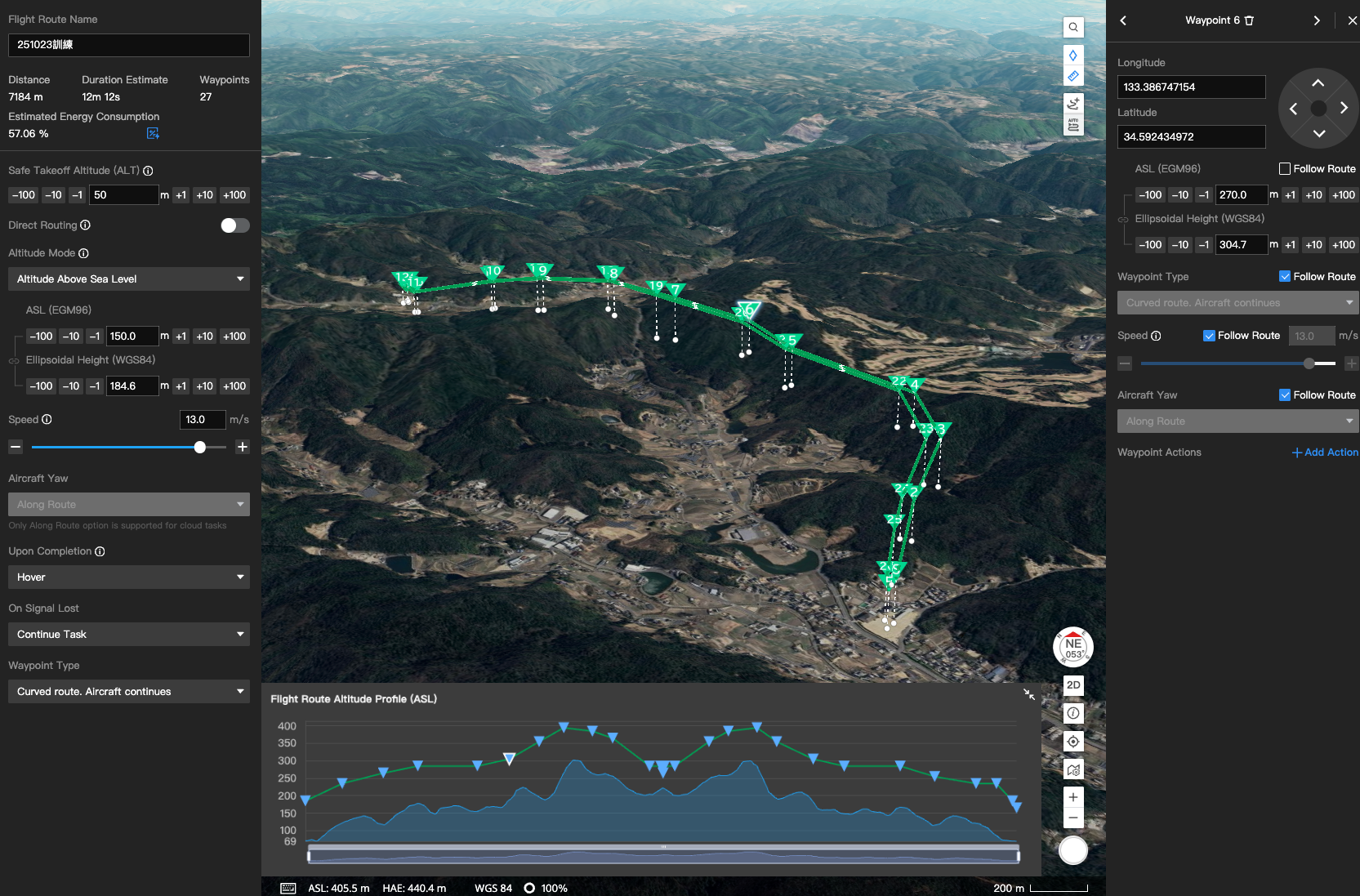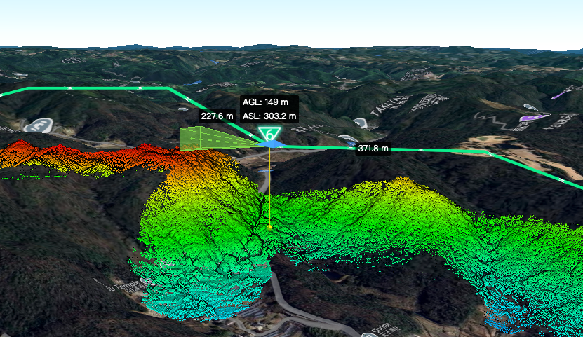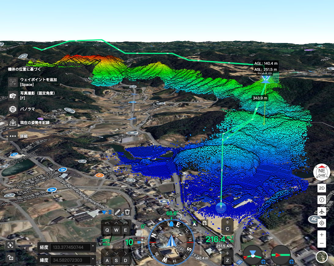 3D測量技術を活用した地形・障害物把握 DJI Matrice 300 RTK + LiDARセンサーを使用し、飛行ルート全域の3次元地形データを取得。山間部の複雑な地形、送電線の位置、緊急着陸候補地を事前に把握し、27地点のウェイポイントを最適配置しました。 |