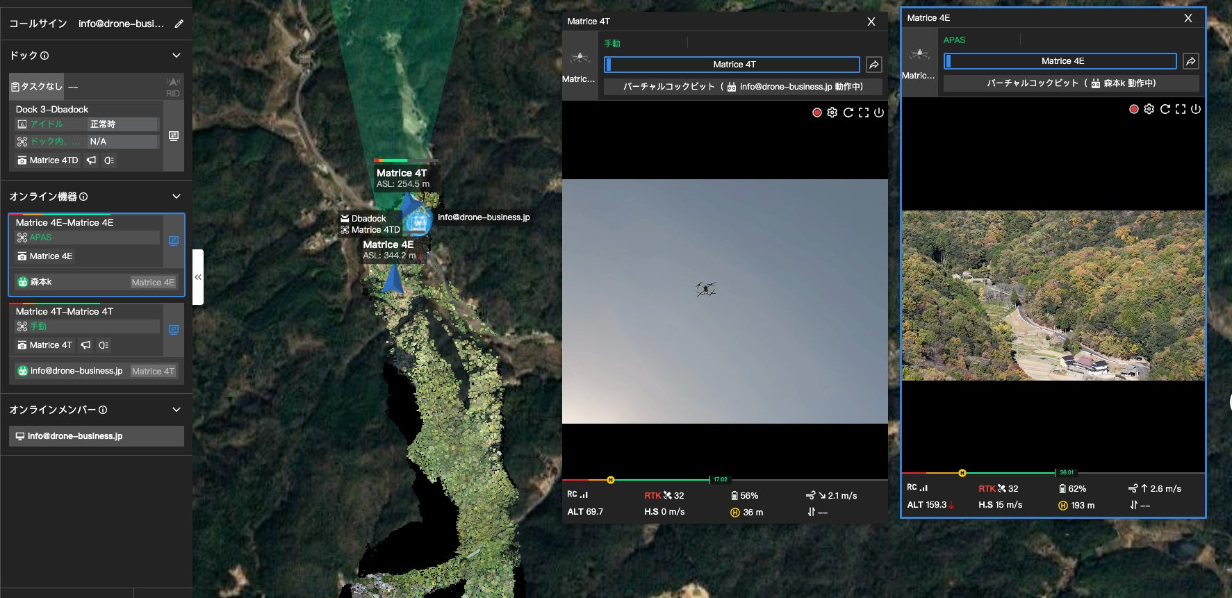 4. 1台のPCによる4機同時飛行制御 本訓練の技術的ハイライトとして、DJI FlightHub 2およびDJI DeliveryHubを活用した複数機体の統合管理を実施しました。 同時運用機体 ・FlyCart30(FC30):物資輸送 ・Matrice 4E:空撮・追尾撮影 ・Matrice 4T:調査・スピーカー搭載 ・Matrice 4TD + Dock3:遠隔自動離着陸 1名のオペレーターが1台のPCから4機の位置情報、バッテリー残量、カメラ映像をリアルタイムで監視・制御し、大規模災害時の効率的なドローン運用体制を実証しました。 |