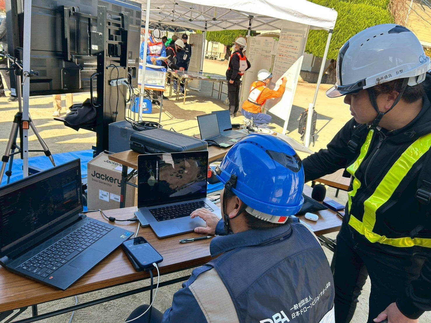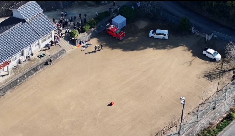 2. ドローン搭載スピーカーによる避難者との双方向通信 調査用ドローン(DJI Matrice 4T)に搭載したスピーカーを使用し、3km先の避難者への呼びかけと、カメラによる状況確認を実施しました。 通信内容 ・本部から避難者への安否確認 ・指示伝達 避難者の状況(人数、負傷者の有無等)の映像確認 ・住民自身がモニターで「ドローンからどう見えているか」を確認 この訓練により、避難者側も「発見されやすい行動」「意思疎通しやすい合図」を体験的に学ぶことができました。災害時、救助を待つ側がどのように行動すべきかを知る貴重な機会となり、参加した住民からは「ドローンからの視点を初めて体験できた」「どう動けば見つけてもらいやすいかがわかった」との声が上がりました。 |