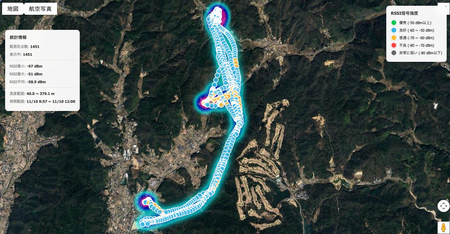 上空電波環境調査(RSSI測定) 飛行ルート上1,451地点で電波強度(RSSI)を測定し、通信品質を事前検証。 測定結果 測定点数:1,451地点 RSSI平均値:-58.9dBm 良好電波エリア(-60dBm以上):90.7% 山間部の一部で電波減衰が確認されましたが、飛行高度の調整により全ルートで安定した通信を確保できることを確認しました。この電波調査データは、3Dマップ上に可視化し、飛行計画の最適化に活用しています。 |