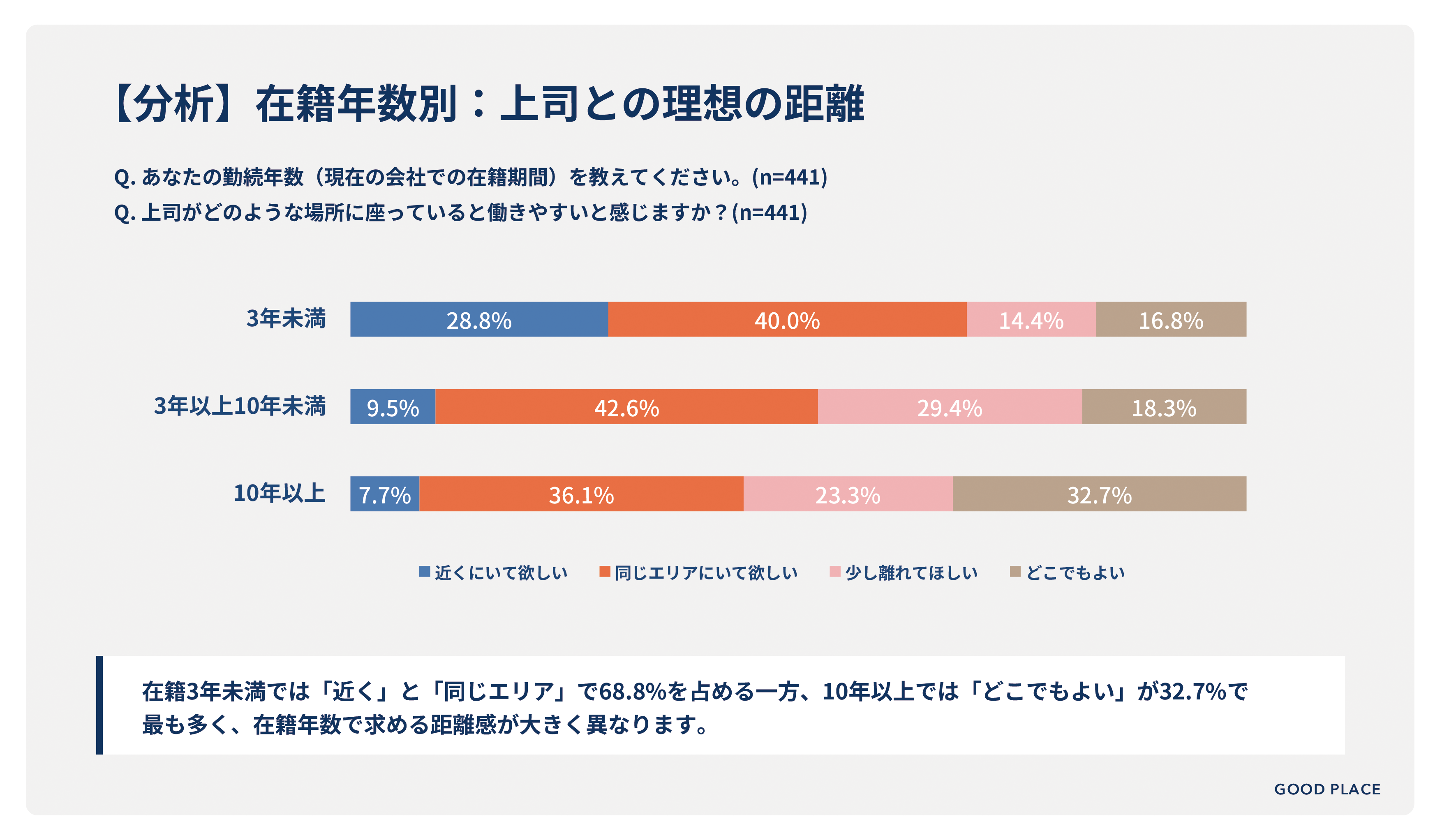 2. 在籍3年未満の28.8%が「上司は近くにいてほしい」、在籍10年以上と3.7倍の差