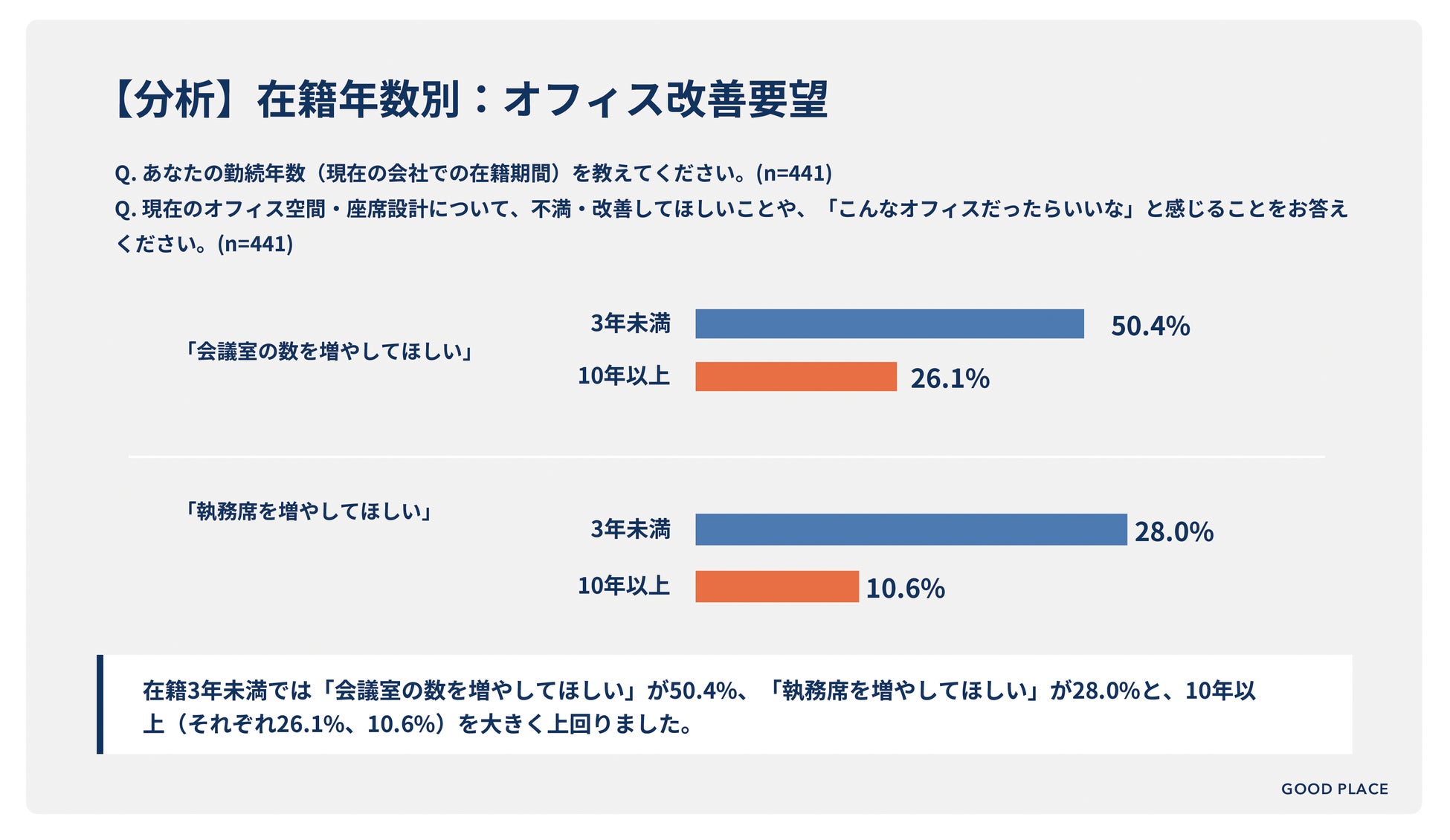 一方で在籍3年未満の不満1位は全体傾向とは異なり、「同じような席しかなく、その日の業務に合った席が選びにくい」という不満でした。割合は41.6%と高く、在籍10年以上層の9.4%と比較すると4.4倍の違いがありました。