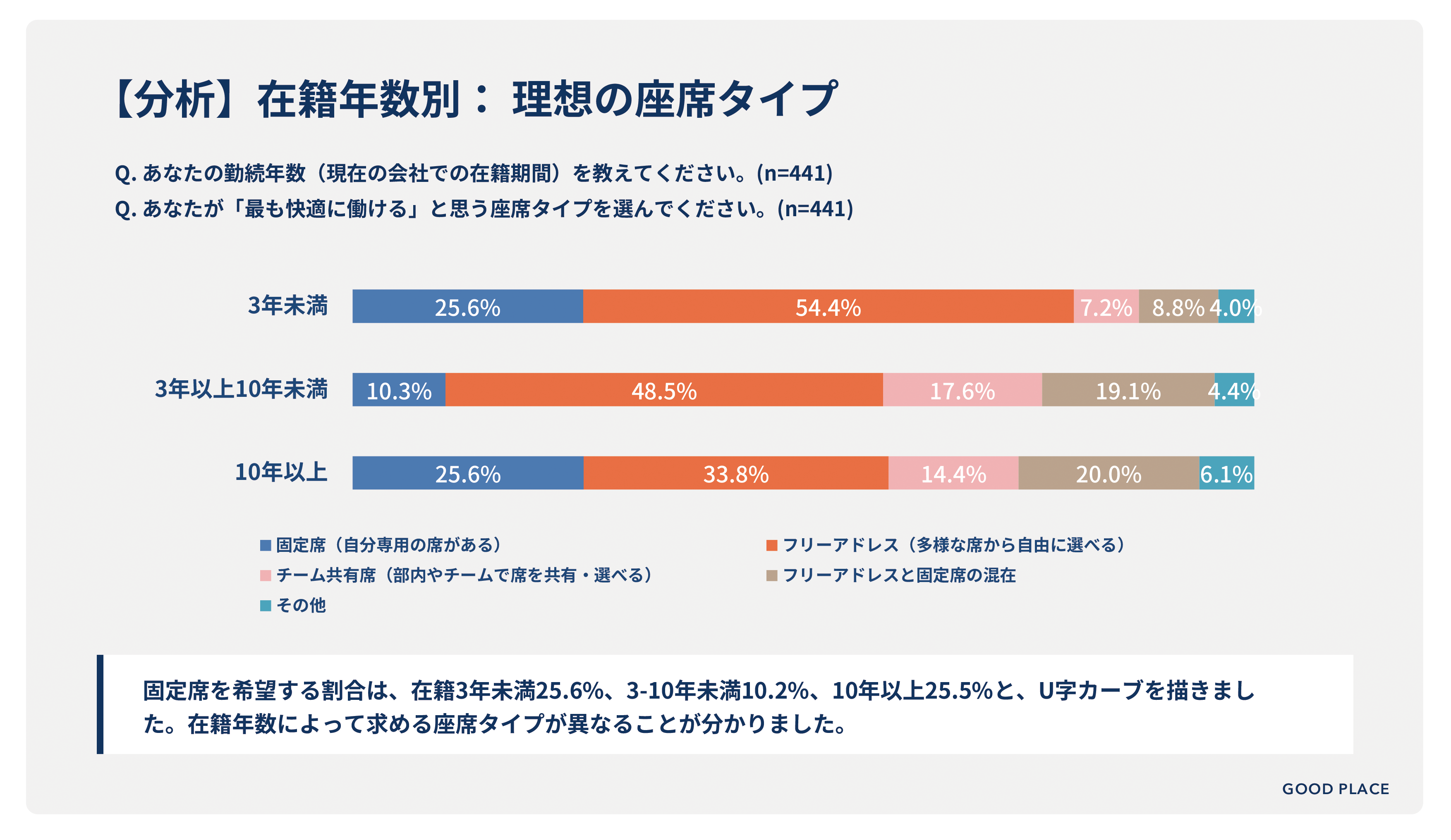 さらに在籍年数別に見ると、在籍3年未満と10年以上の層で固定席を希望する割合が、いずれも25.6%と全体平均を上回る結果となりました。これは、3〜10年未満の層と比較して2倍以上の差であり、在籍年数によってニーズが分かれる傾向が見て取れます。