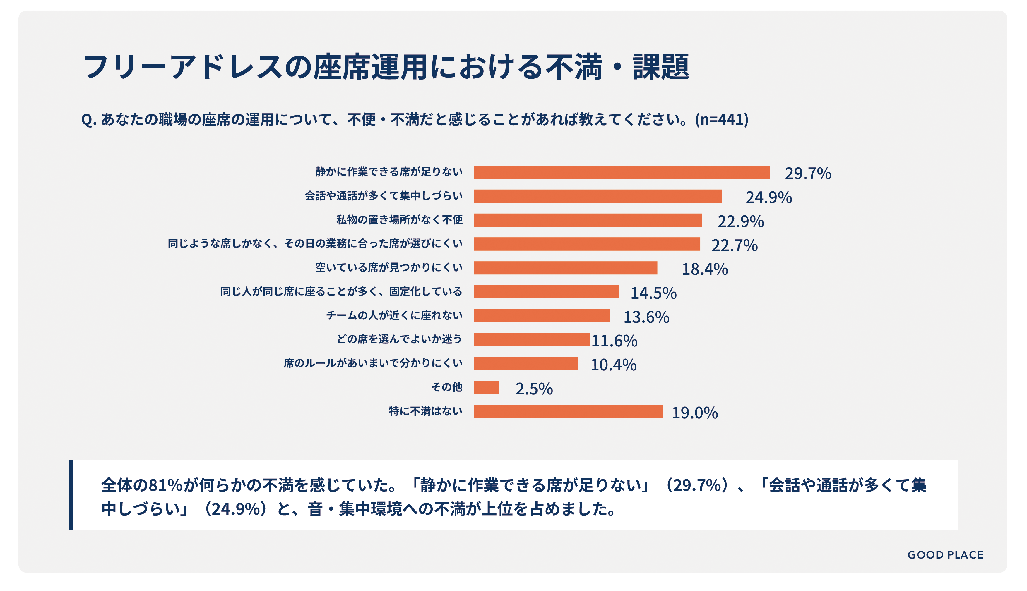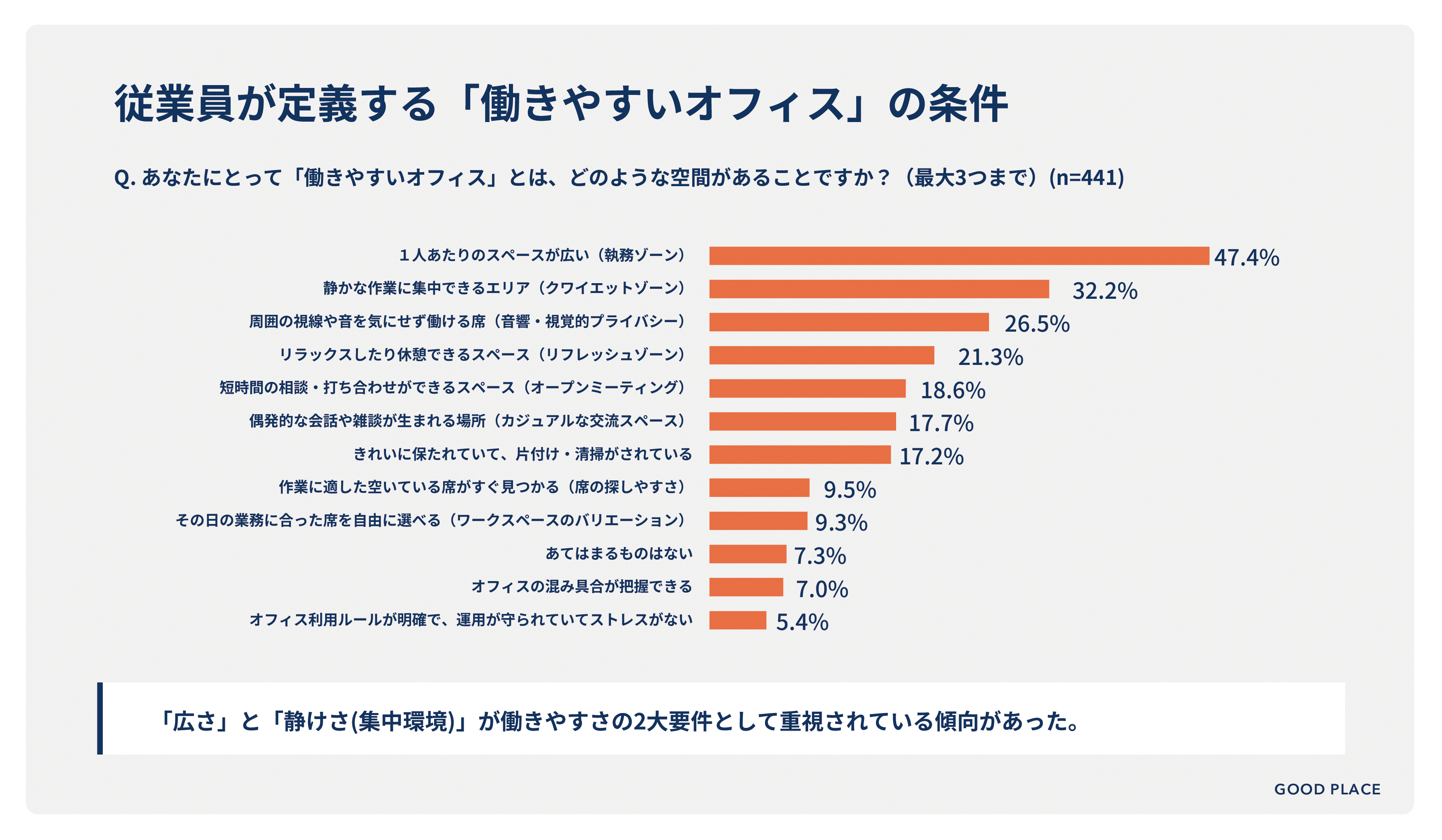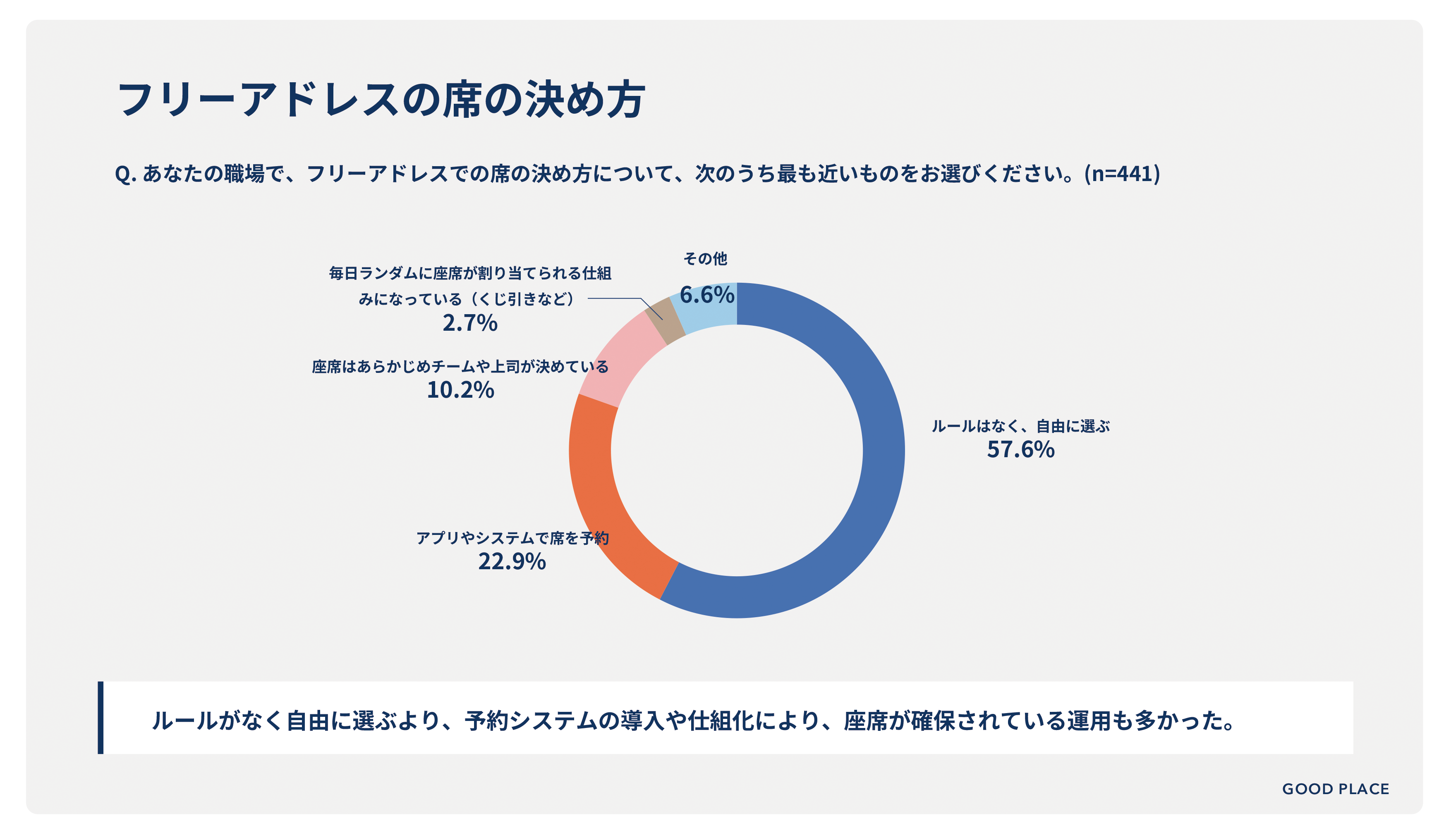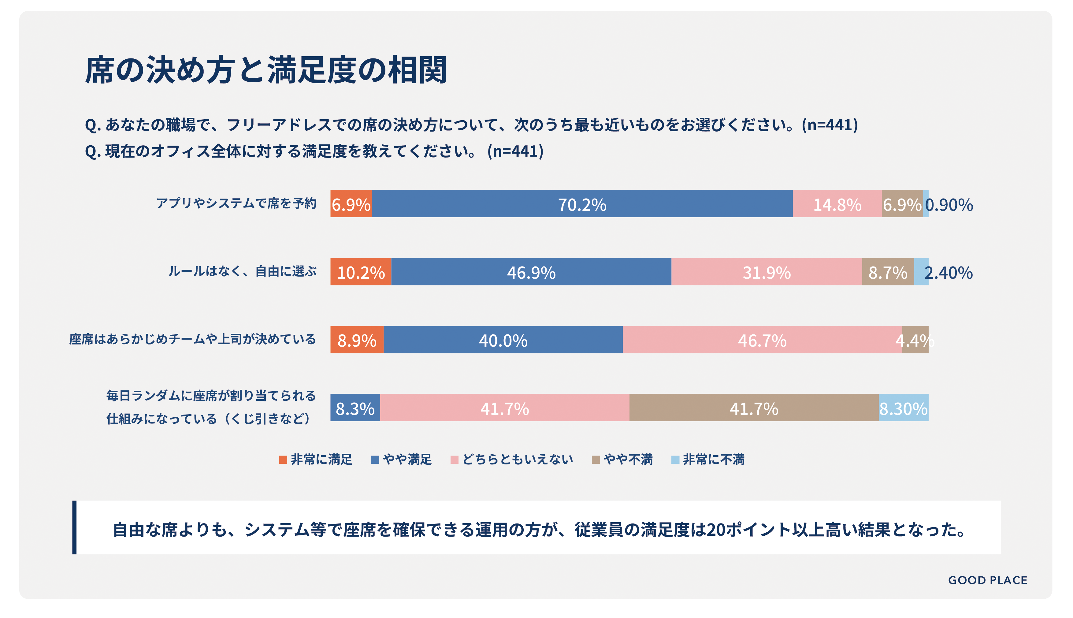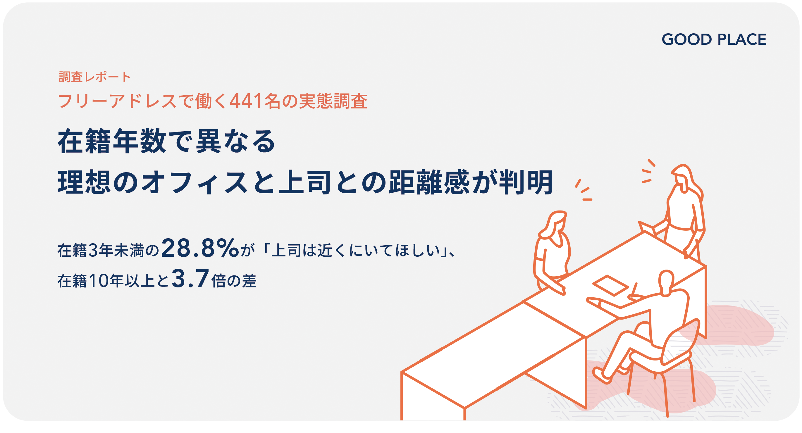 建物のリノベーション、オフィス構築、バックオフィス業務のアウトソーシングを通じて「より良い場」を創造する建築会社の株式会社GOOD PLACE(旧株式会社コスモスモア、本社:東京都渋谷区、代表取締役社長:宮 信司)は、フリーアドレスオフィスで働く会社員441名を対象に「フリーアドレスオフィスの実態調査」を実施しました。