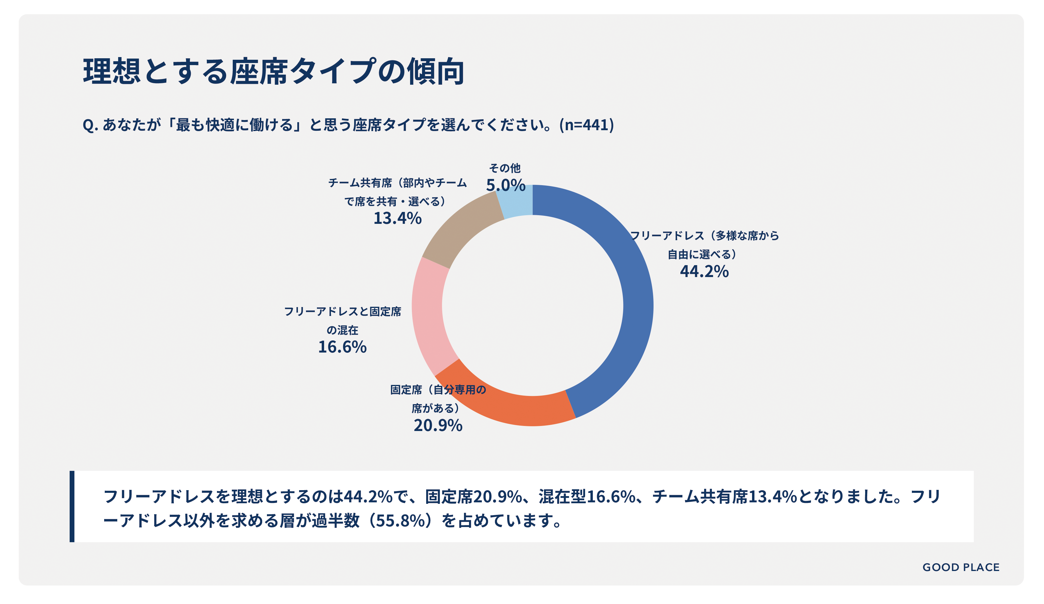 1. フリーアドレスを理想とするのは44.2%。 固定席を求める層は20.9%と、多様なニーズが存在