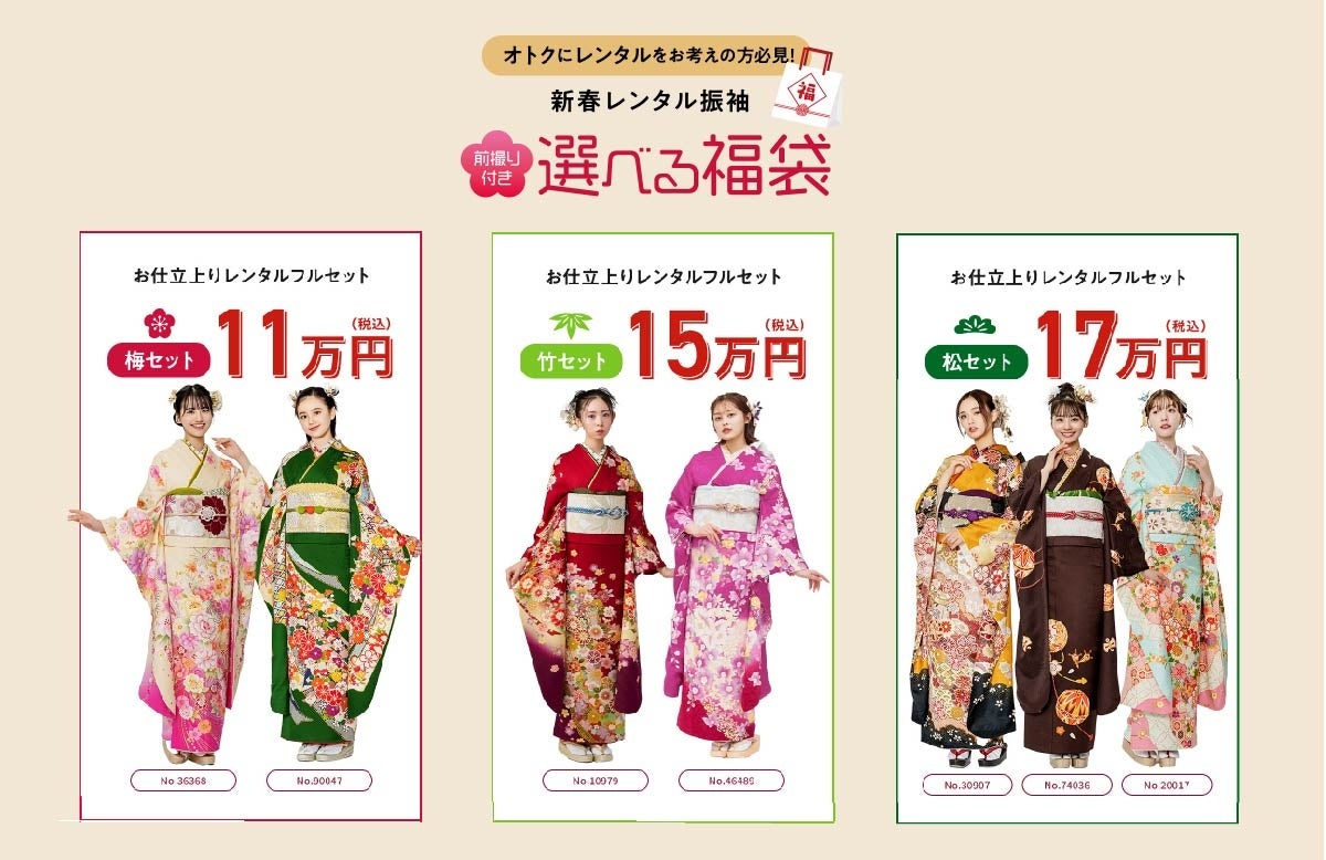 超目玉企画!お手軽にレンタルしたい方にぴったりの、中身が選べる福袋セットを松17万円(税込)・竹15万円(税込)・梅11万円(税込)の三つの価格帯でご用意。振袖一式に加え、着付けに必要な新品小物セットも全て付いてくる大変お得な福袋セットです。