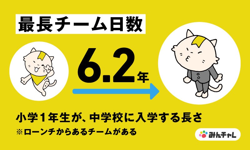 作成されてからの日数が最も長いチームは6.2年、5人全員がチャレンジを達成した日数が最も多いチームは1947日でした。