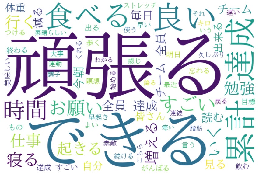 2022年1月に投稿された言葉の種類で最も多かったのは「頑張りました」、「頑張りましょう」、「頑張ってください」などの「頑張る」でした。次に多かったのは「〜できました」などの「できる」、次いで「良い」でした。その他には、チャレンジ達成をお祝いする「累計達成」や「全員達成」などの文字も多くみられ、全体的にポジティブな言葉が目立ちました。