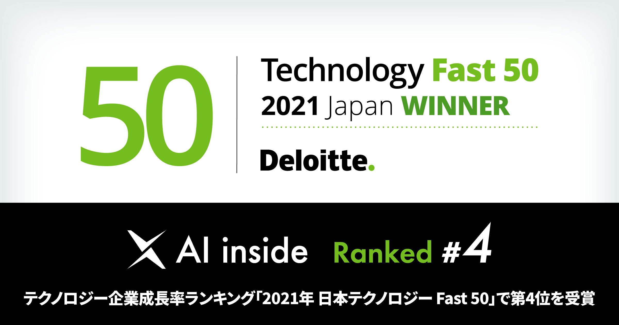 AI inside 株式会社(本社:東京都渋谷区、代表取締役社長CEO:渡久地 択、以下「AI inside」)は、デロイト トーマツ グループが発表したテクノロジー・メディア・テレコミュニケーション(以下、TMT)業界の収益(売上高)に基づく成長率のランキング、「デロイト トウシュ トーマツ リミテッド 2021年 日本テクノロジー Fast 50」において、過去3決算期の収益(売上高)に基づく成長率932.5%を記録し、4位を受賞いたしましたことをお知らせします。なお、2019年から3年連続の受賞となります。