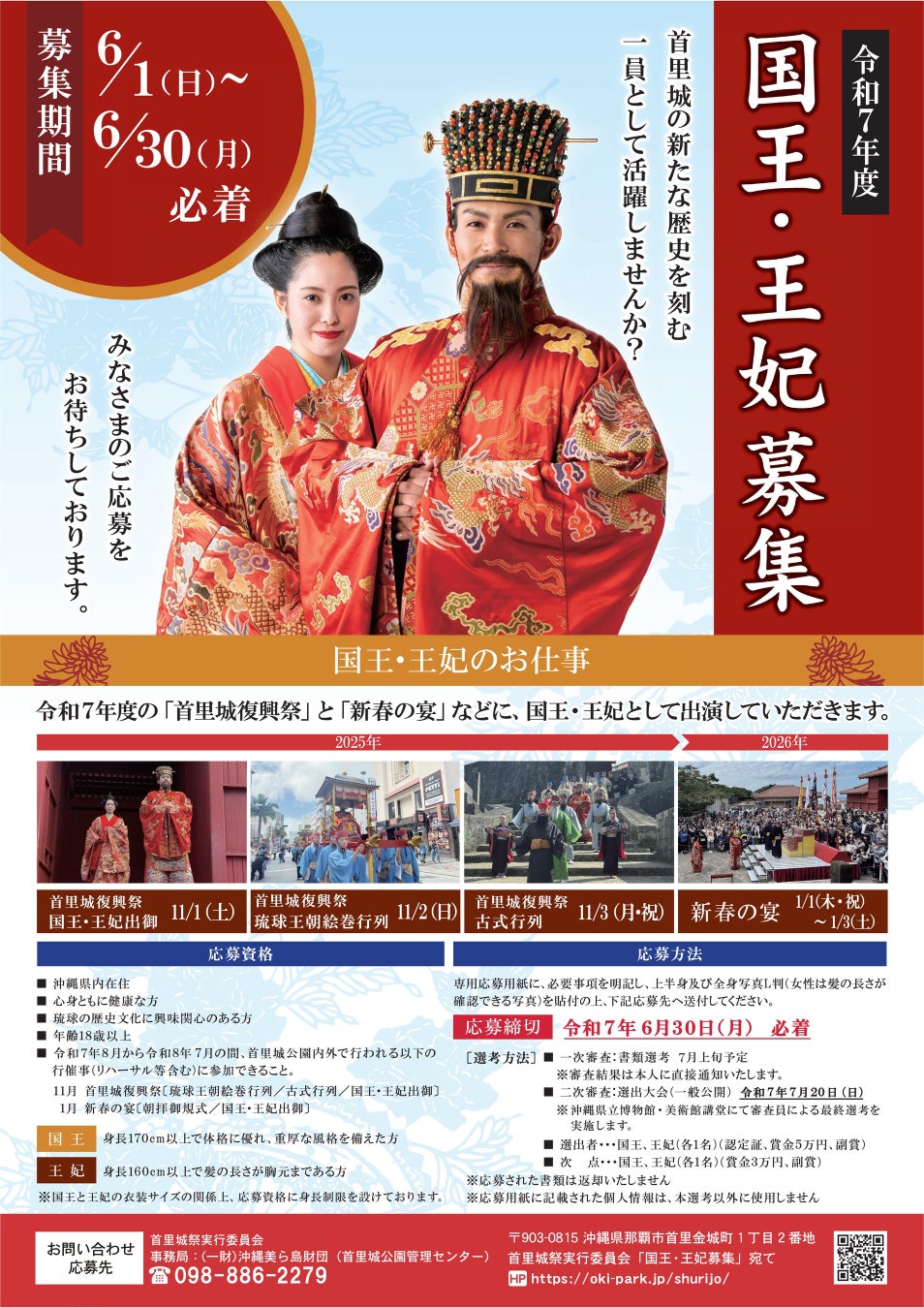 首里城祭実行委員会は、令和 7 年度の『国王・王妃』を募集します。首里城復興を盛り上 げ、琉球王国の歴史文化の魅力を発信する大切な役割を担ってくださる『国王・王妃』へ、 皆様のご応募をお待ちしております。