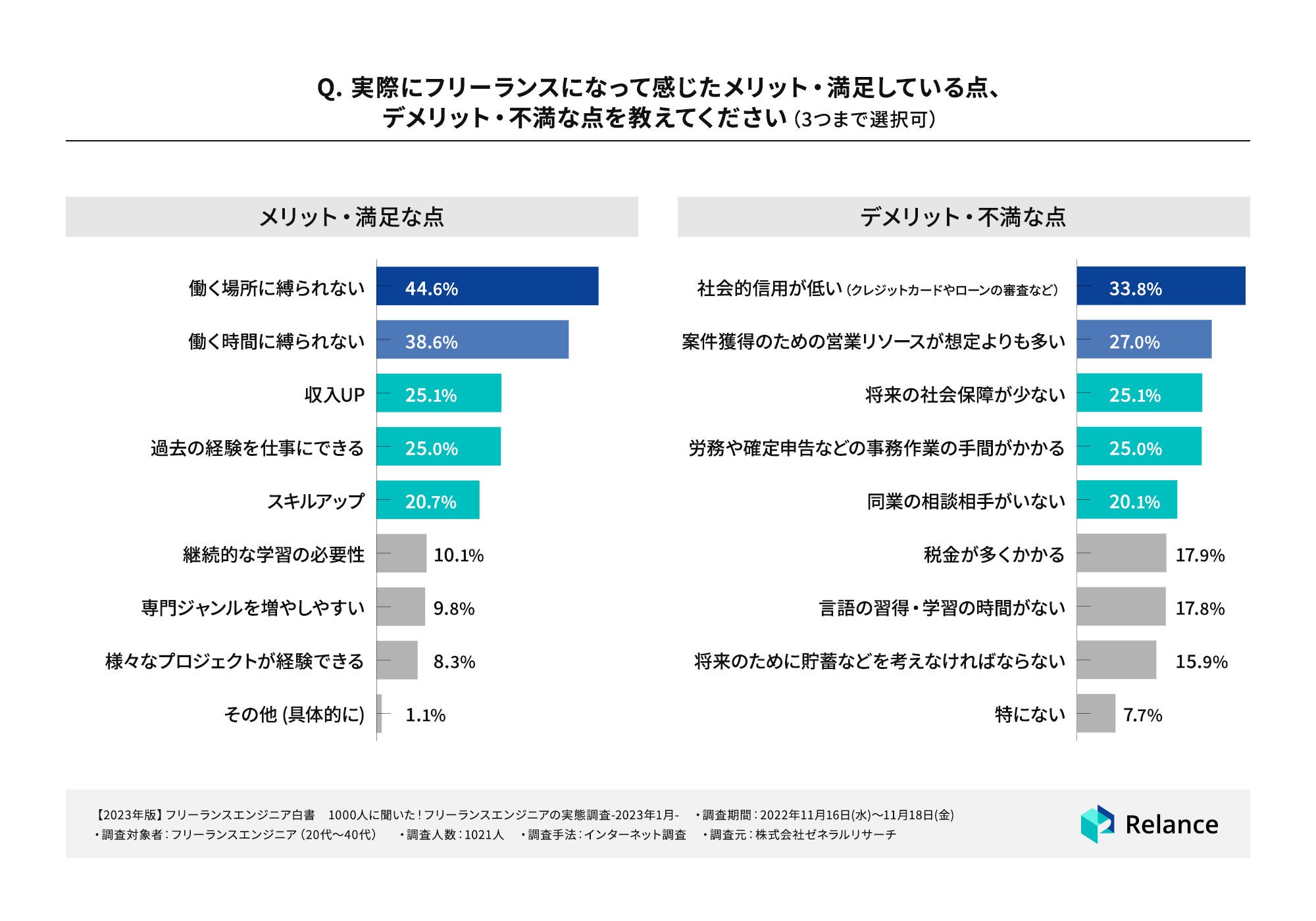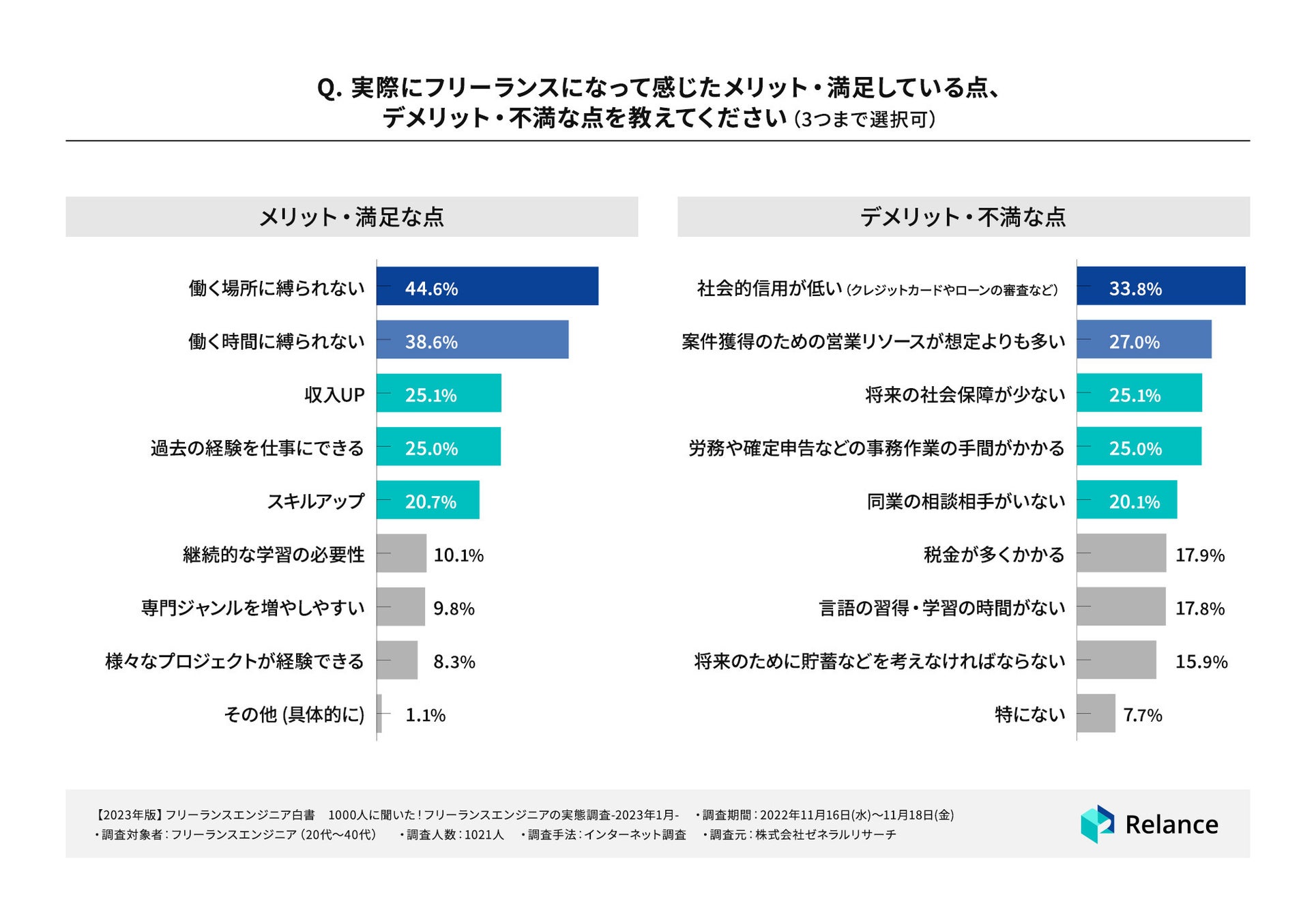 「実際にフリーランスになって感じたメリット・満足している点、デメリット・不満な点を教えてください(3つまで選択可)」