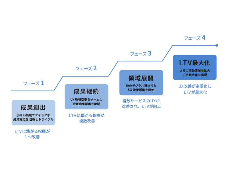 ステップとして、まずは特定テーマに絞り「その企業が本当にUXグロースを通じてビジネス成長できるのか」をクイックに検証するところから始めます。UX課題が多くあり改善によって確実に成果が上がることを確認できたら、改善の頻度を上げるとともに活動領域を拡大し、LTV最大化を目指します。