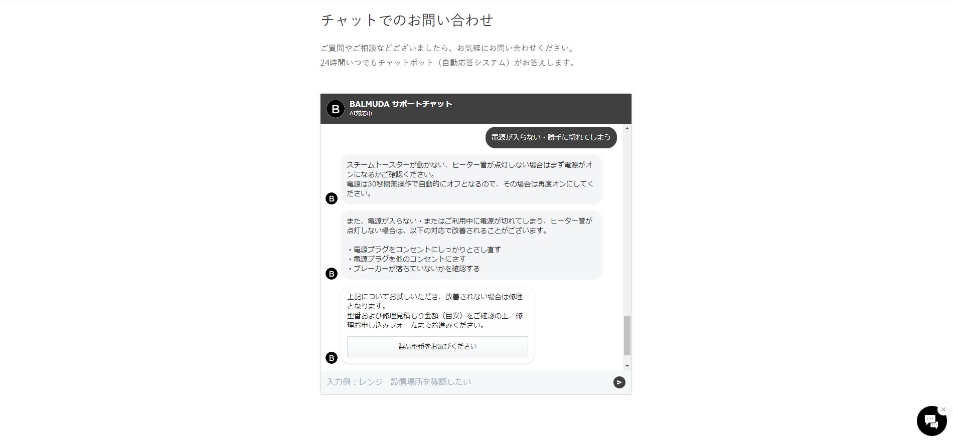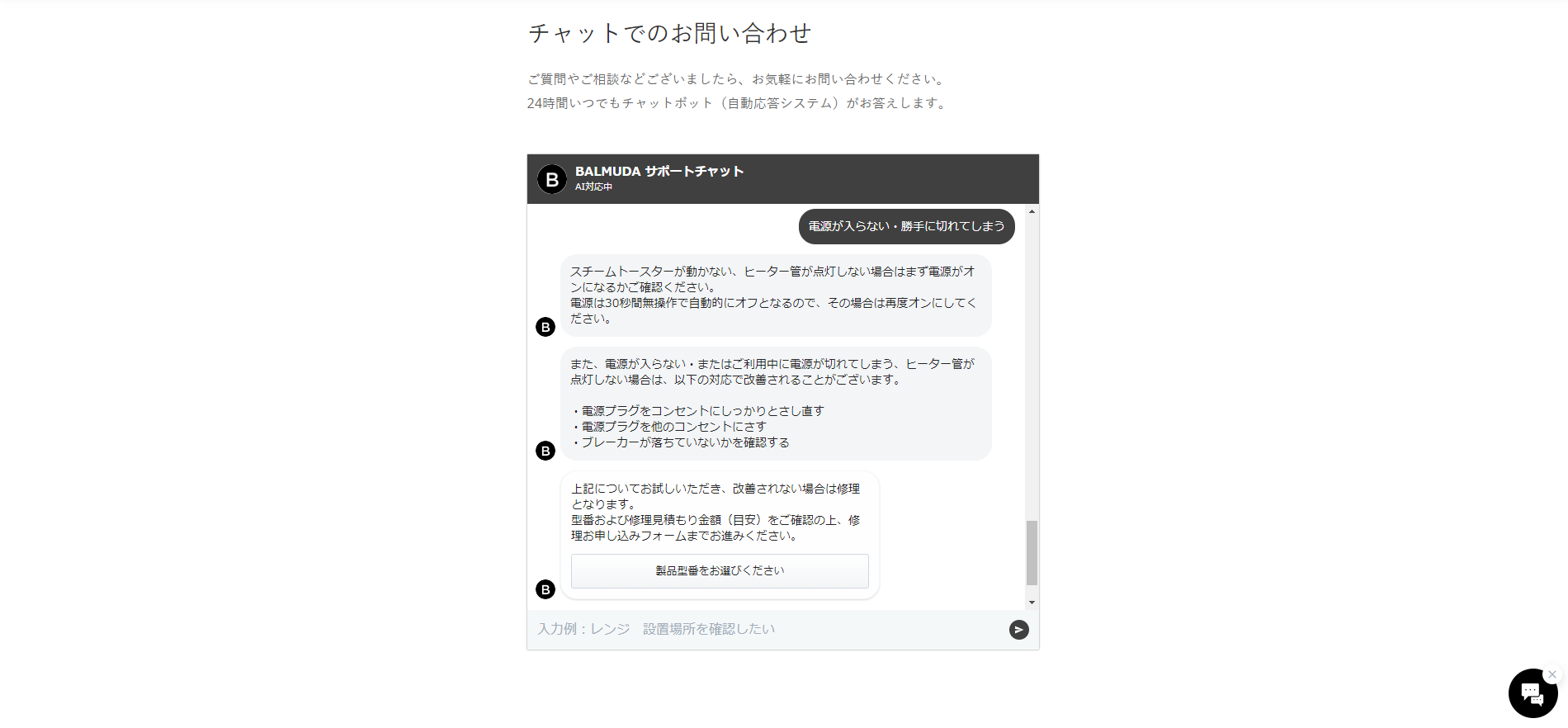 バルミューダの公式オンラインショップの修理サポートを中心に、高精度AIチャットボット「KARAKURI chatbot」・AI搭載FAQツール「KARAKURI smartFAQ」を導入いただきました。ご購入者が製品を使用される中で修理費用やお手入れ方法、不具合改善などを知りたいと思ったときに、WEB上で手軽に情報を取得できるようにサイト上の導線から改革し、ご購入者のセルフサービスの満足度向上を実現いたしました。