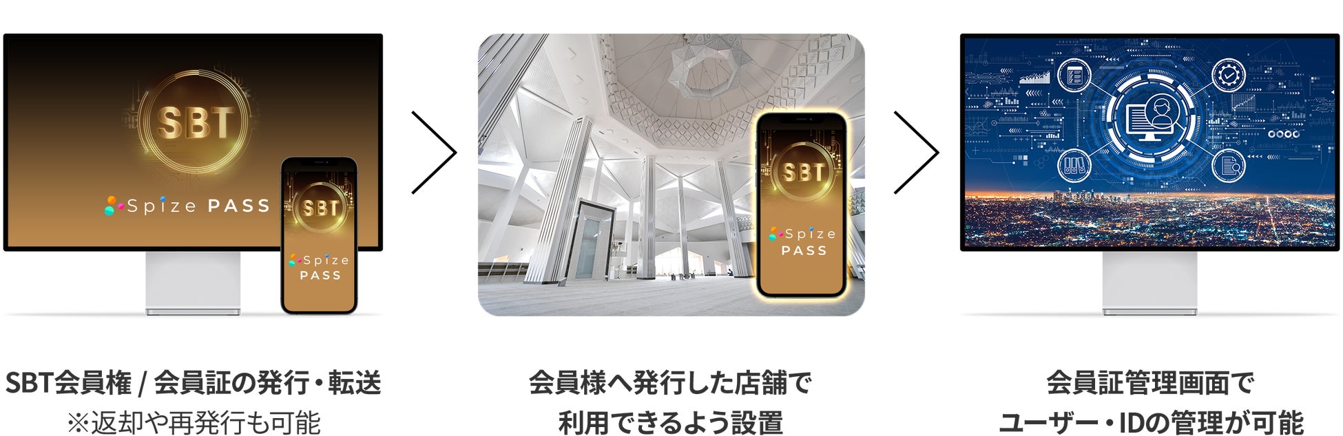 ゴルフ場やホテルなどの施設利用や飲食店の会員証、学校の学歴・学位の証明書、土地や商品の所有権など、様々なシチュエーションで譲渡不可の「Spize PASS」を利用することで、社会的な証明を行えるようになります。また、このSBT会員権/会員証を持つ人だけが受けられる特別なサービスや特典の提供も可能となります。