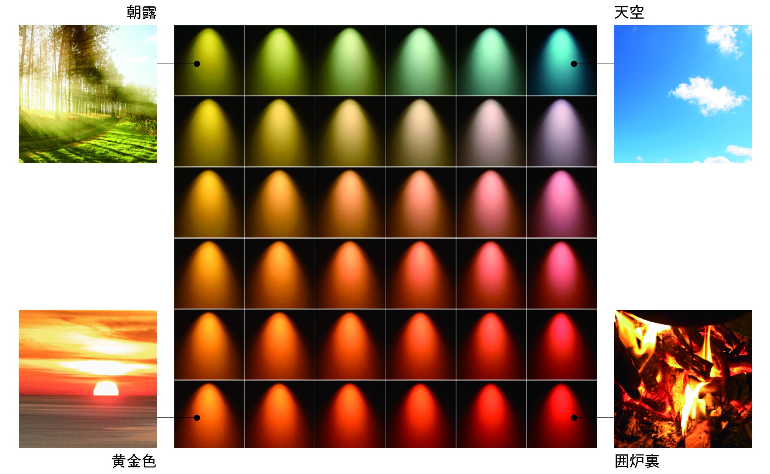 業界初である、1800K(ケルビン)から12000Kまでの光色を選択できることに加え、121種類のカラー演出機能を備えています。通常のライトアップにあるような濃い色彩ではなく、淡いトーンのカラーライティングによって繊細な色を表現できるため、時間の移り変わりや日常に季節感を取り入れる演出などに活用できます。また、照明1灯ごとに点灯・調光・調色ができる為、空間の用途に応じた多彩なシーンを表現することが可能です。